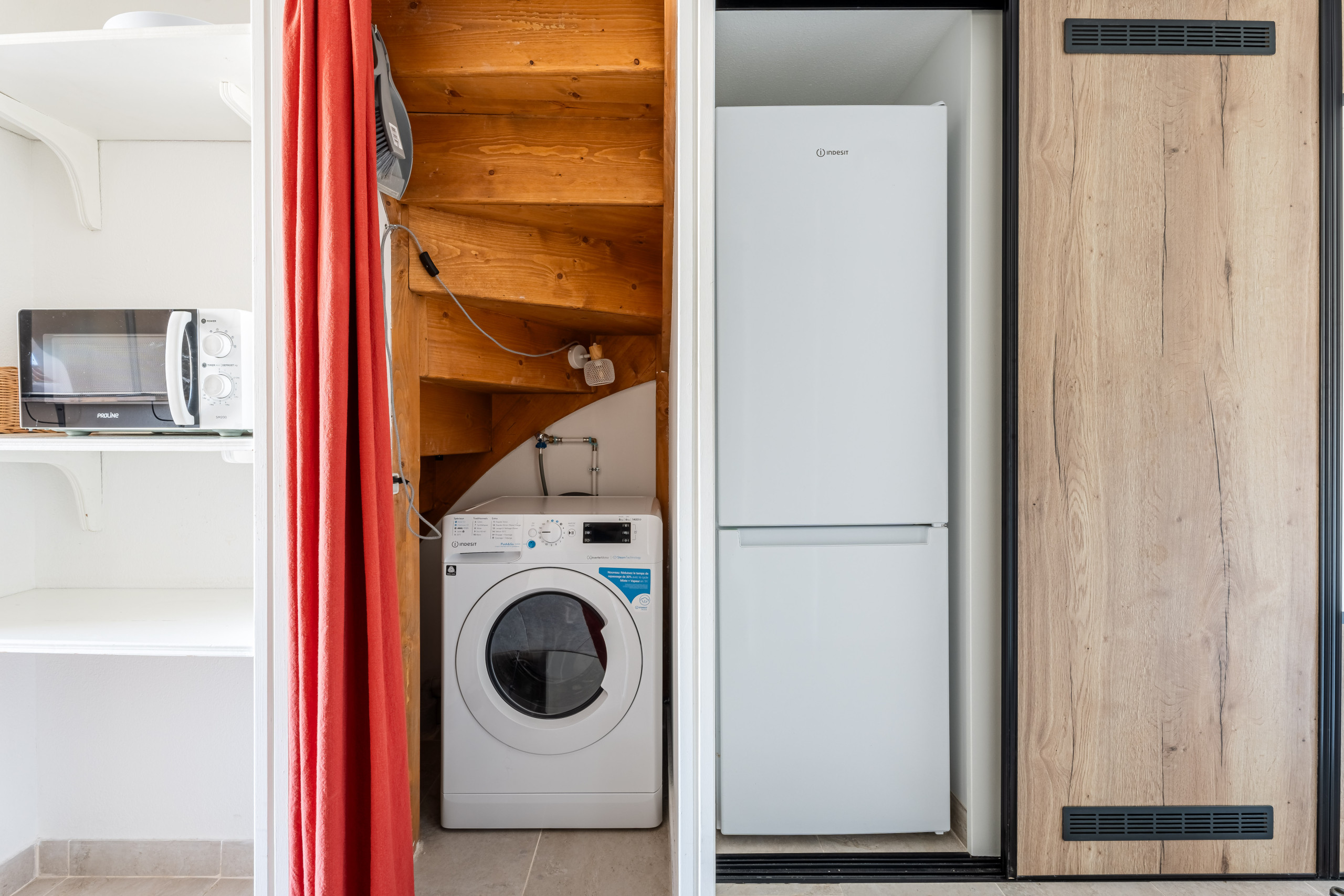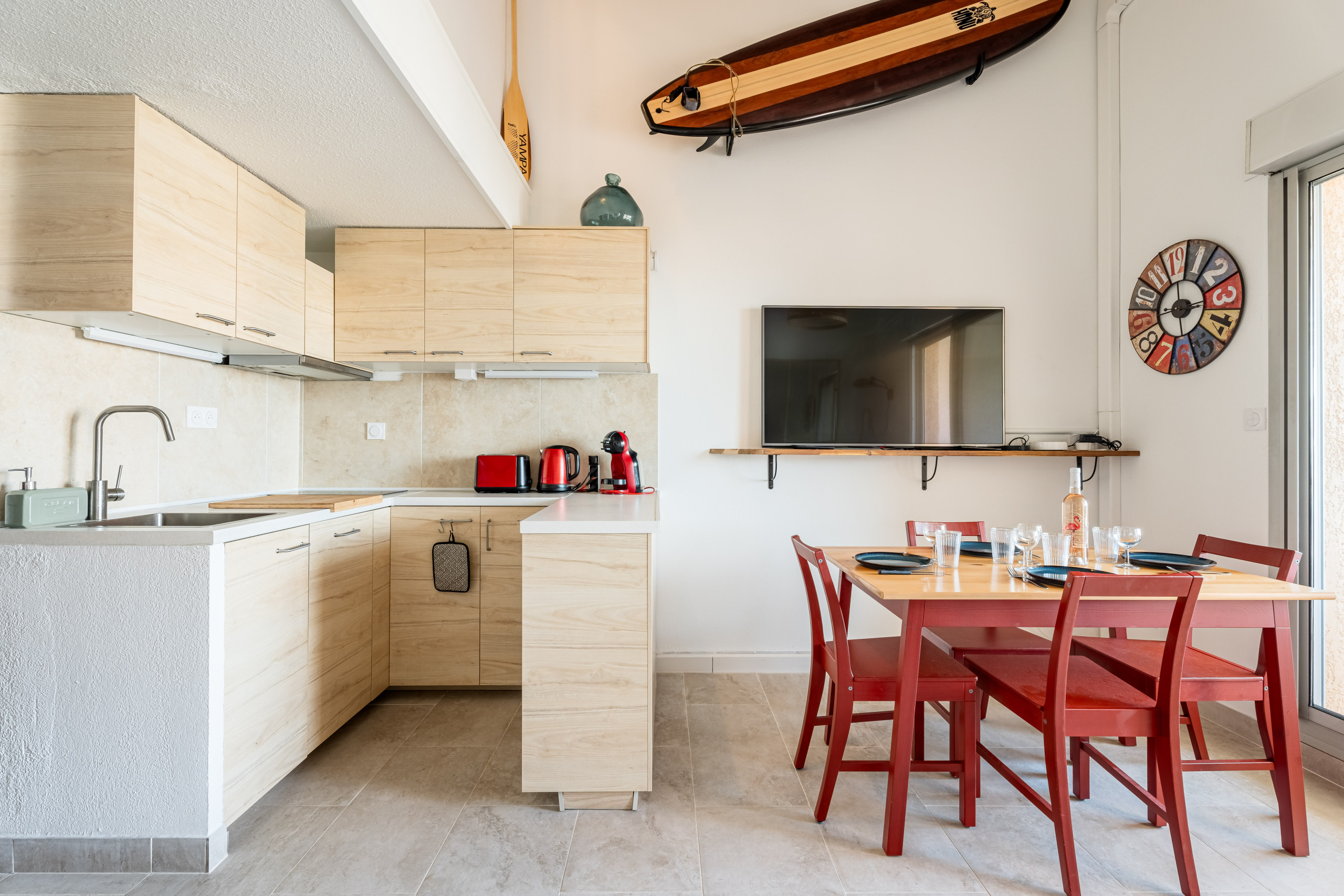 La cuisine américaine, à induction, est équipée avec réfrigérateur, micro-ondes, four, congélateur, lave-vaisselle, vaisselle/couverts, ustensiles/cuisine, cafetière, grille pain, bouilloire et presse-agrumes.