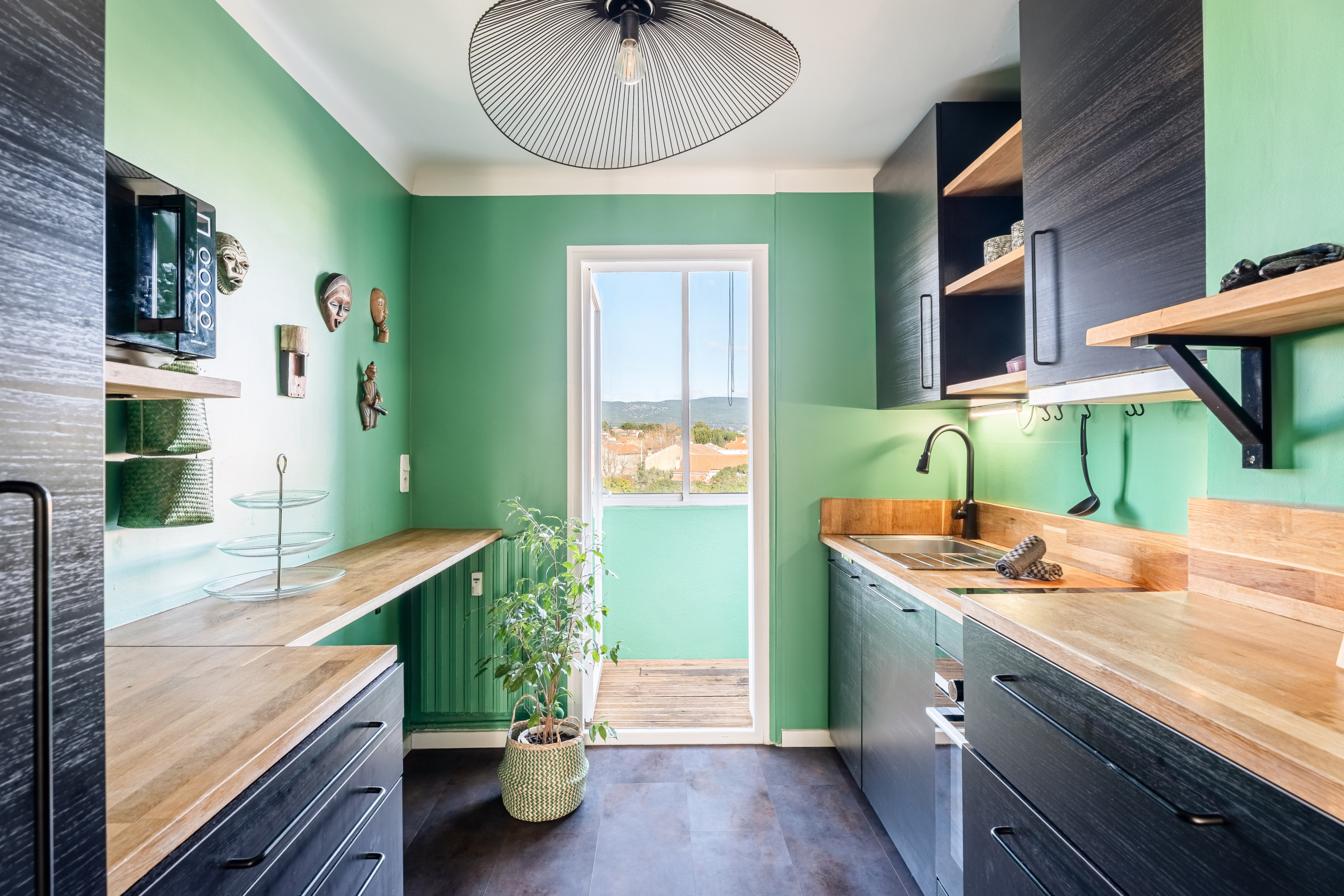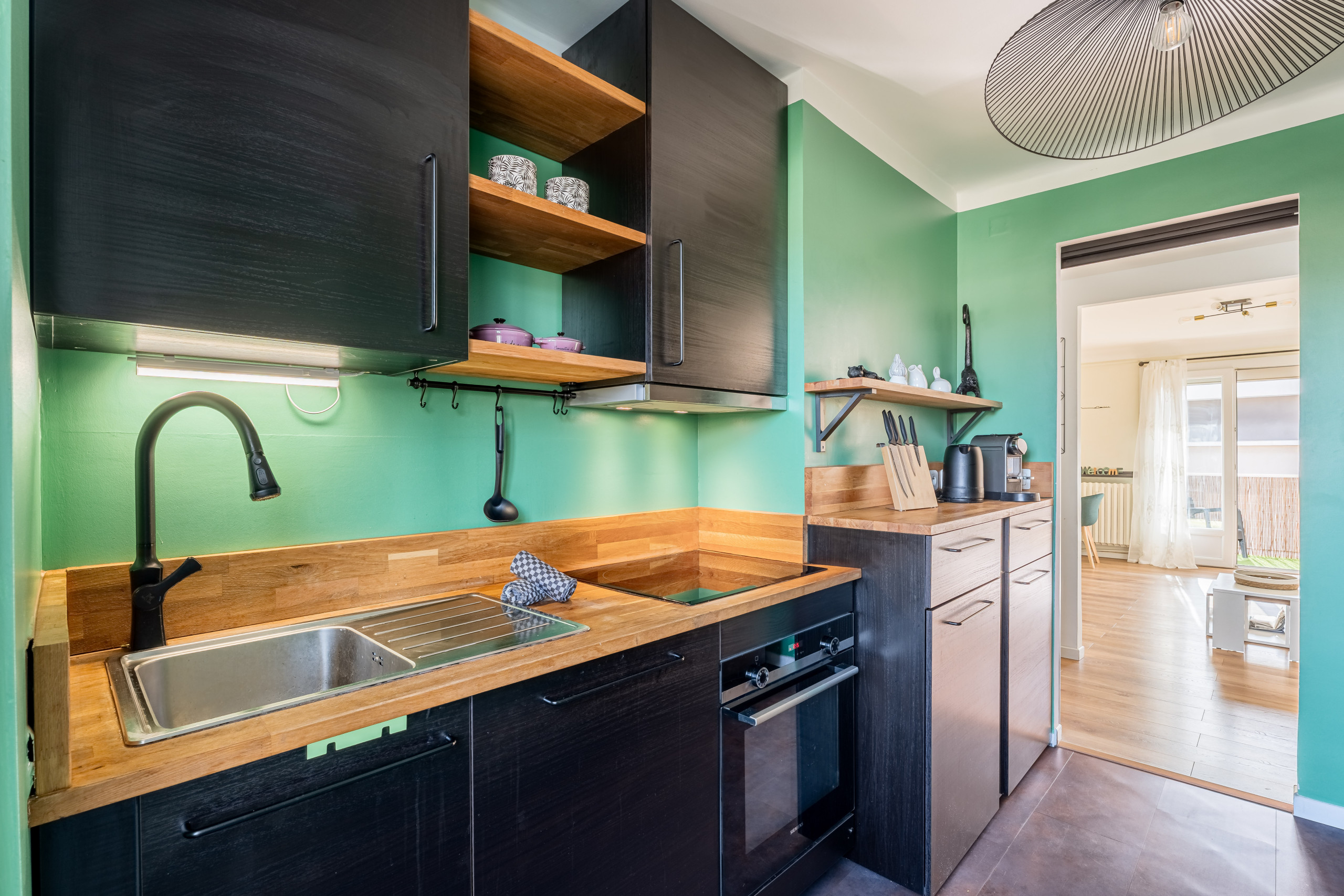 La cuisine est totalement équipée et idéale pour cuisiner de bons plats. Elle donne accès à une loggia qui sert de buanderie avec son lave-linge/sèche-linge.