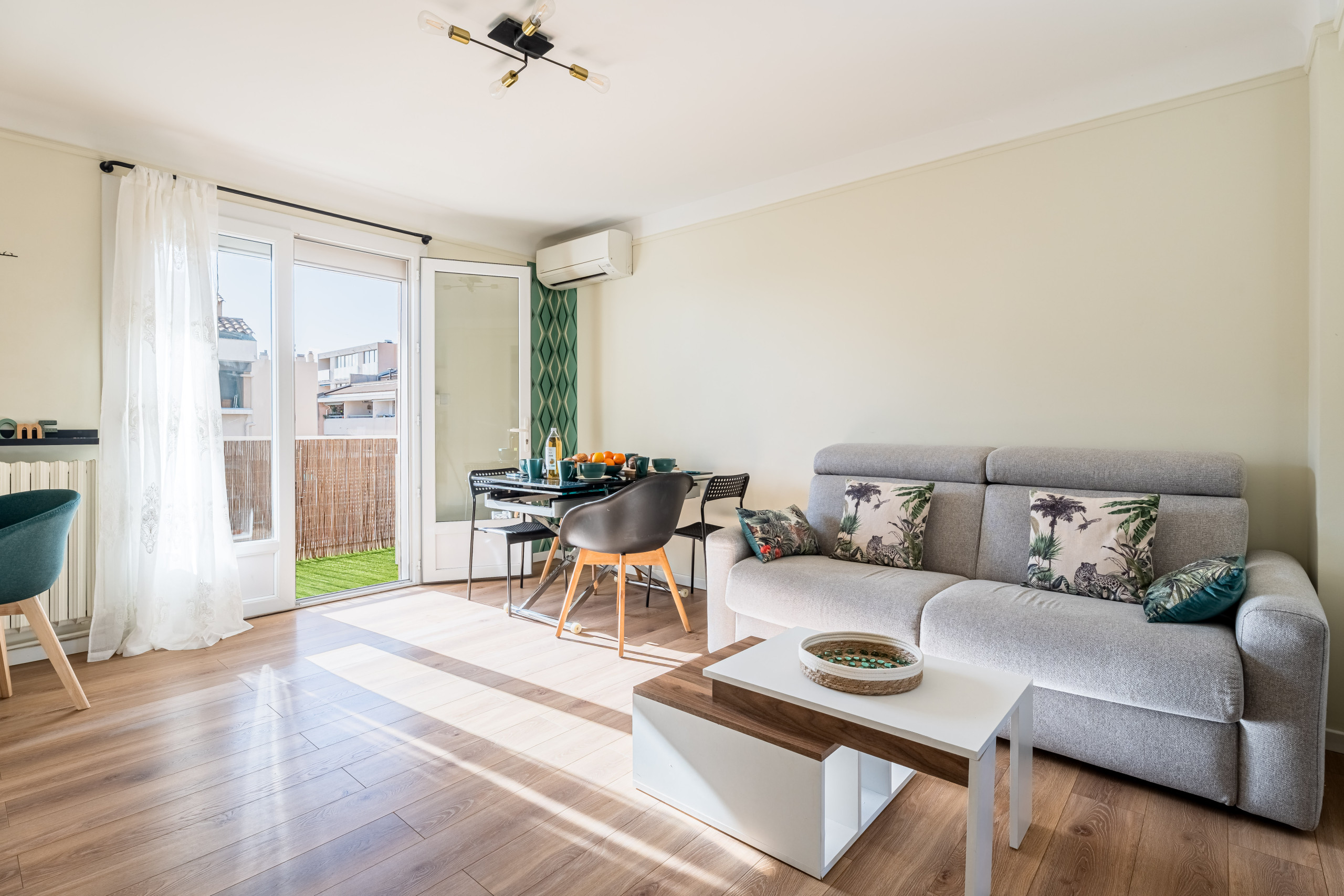 La pièce de vie lumineuse climatisée est agréable avec son espace repas et salon. Un bureau a été installé pour ceux et celles qui devraient travailler (avec modération). La porte vitrée double donne accès directement au balcon qui longe tout l’appartement et offre une vue mer. Profitez du salon extérieur pour partager un apéritif avec vos proches au rythme du climat méditerranéen.