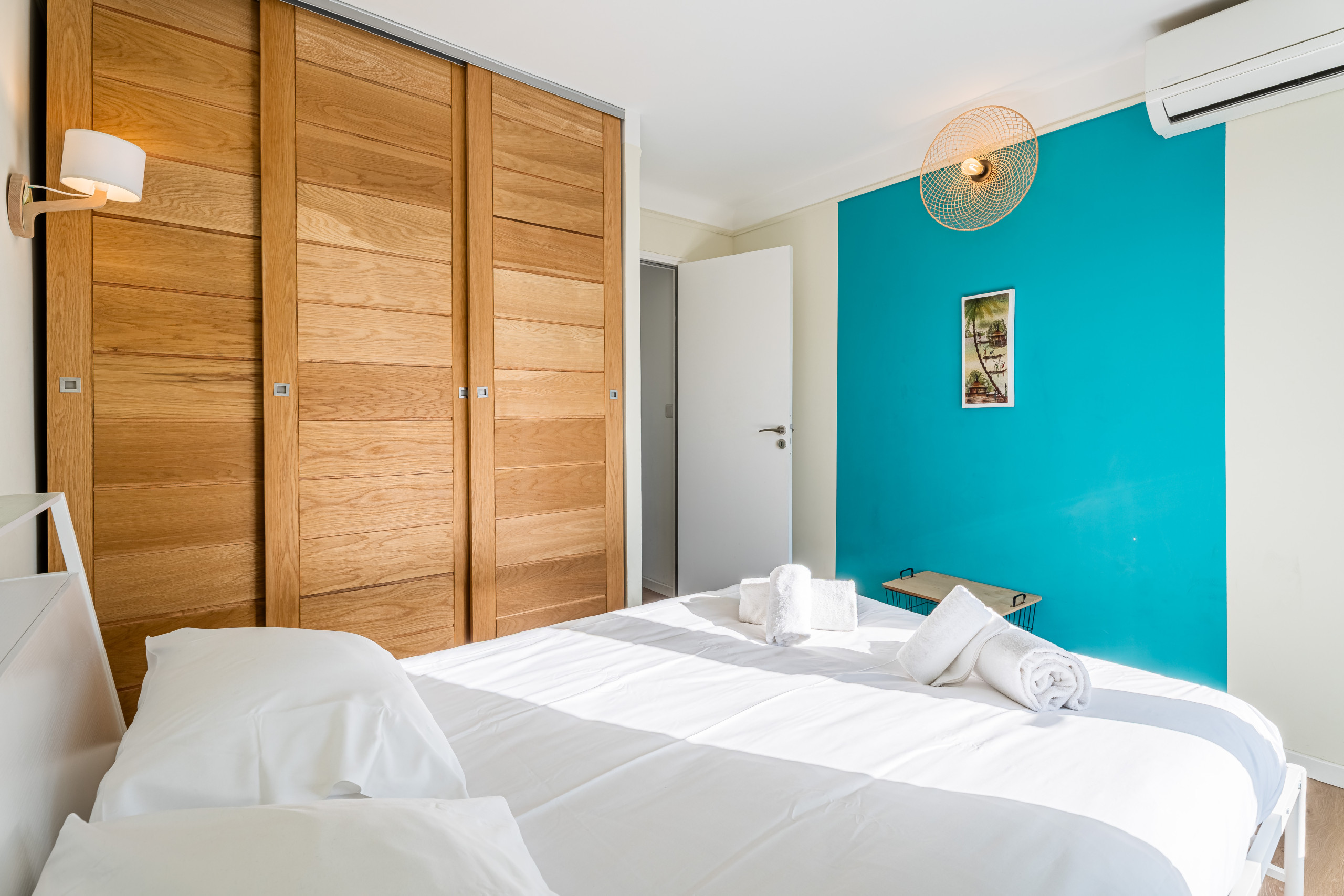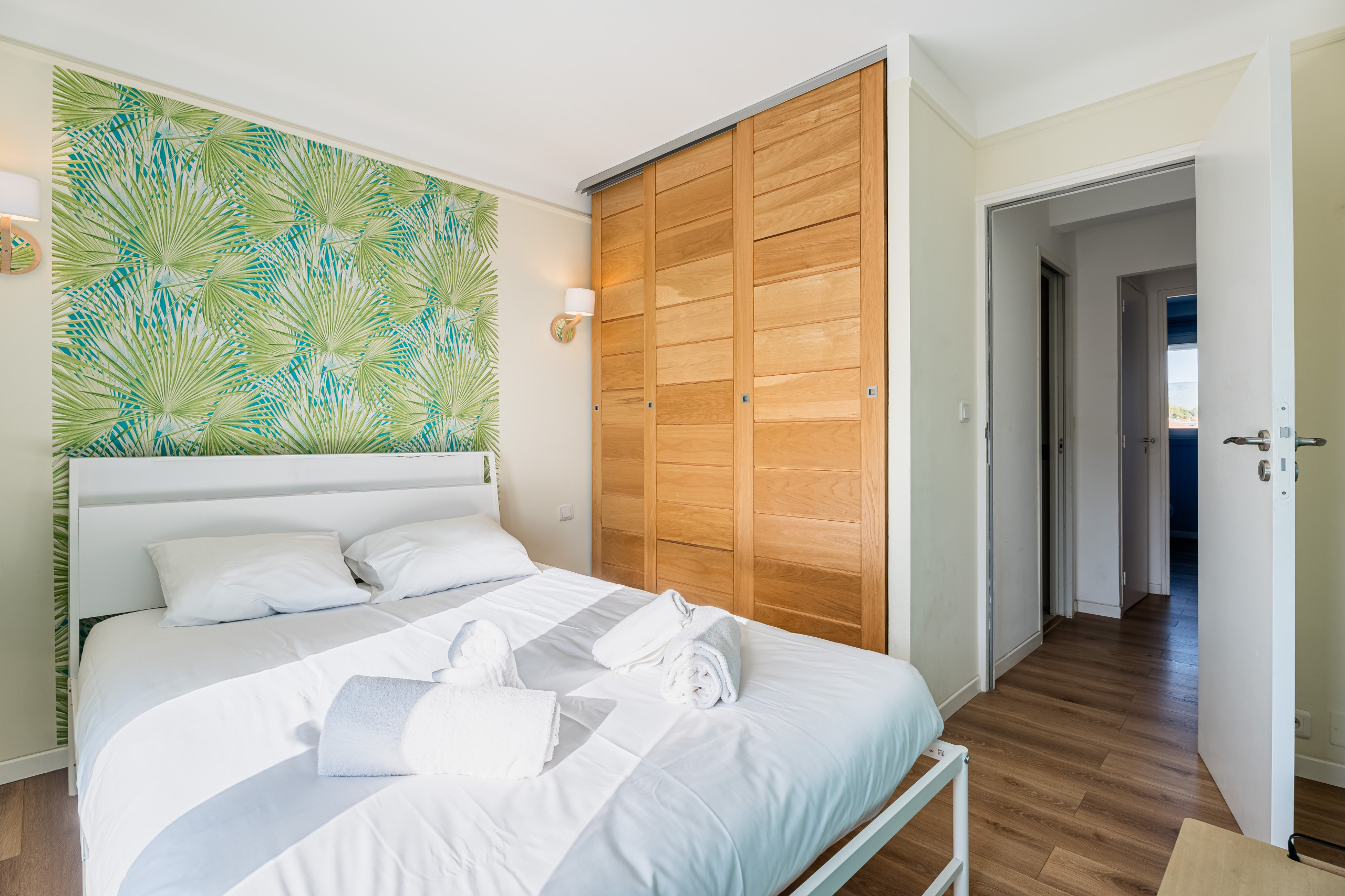 La deuxième chambre climatisée est équipée d’un lit double (140 x 200) récent et confortable mais aussi de grands placards. Elle donne accès directement au balcon.