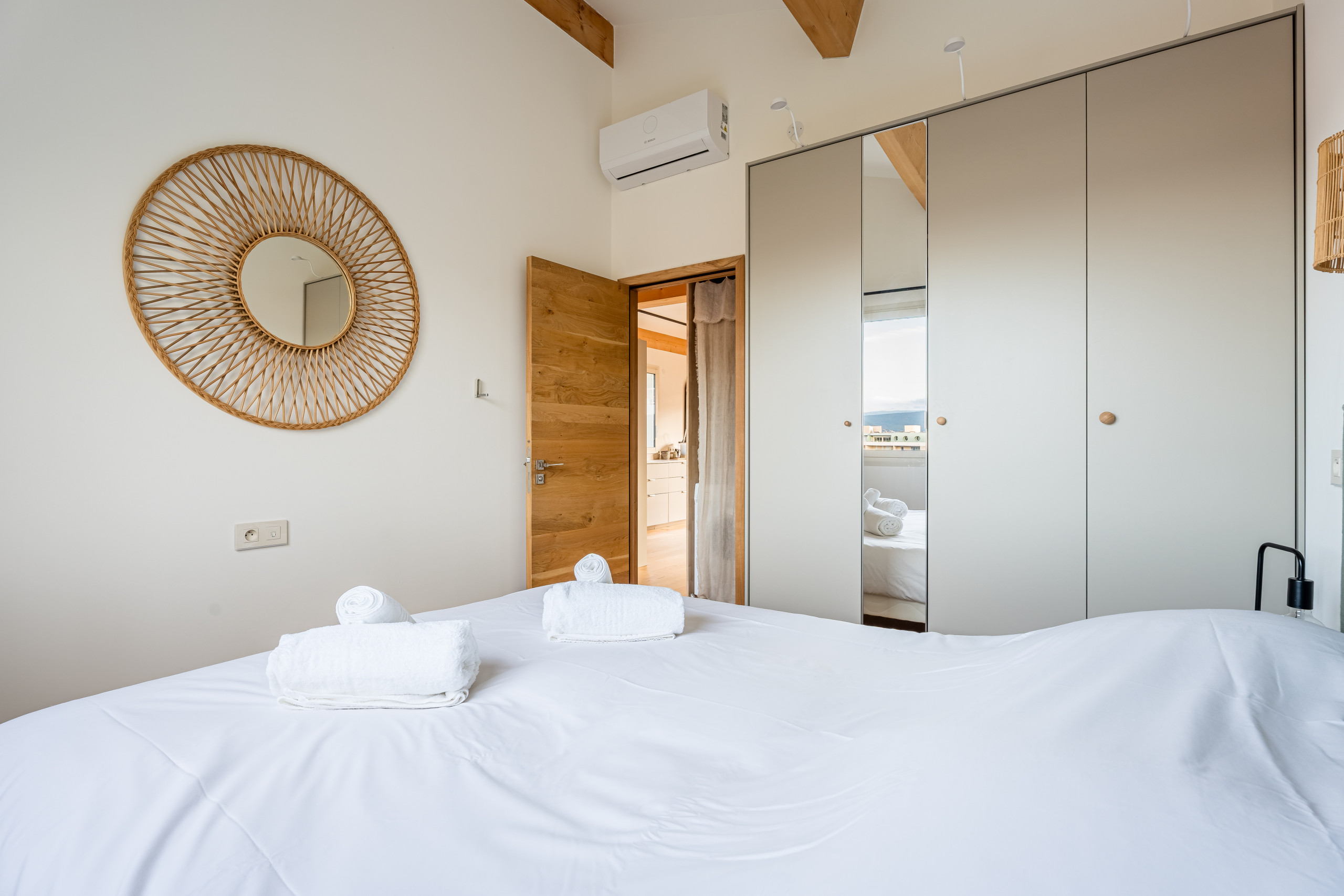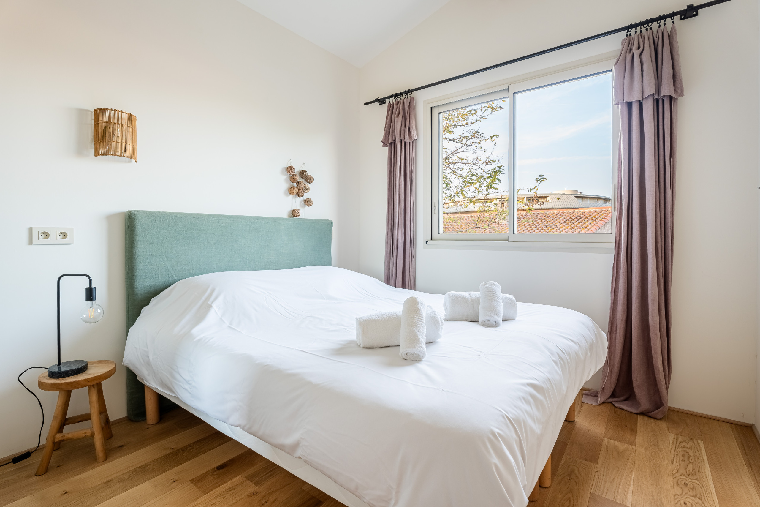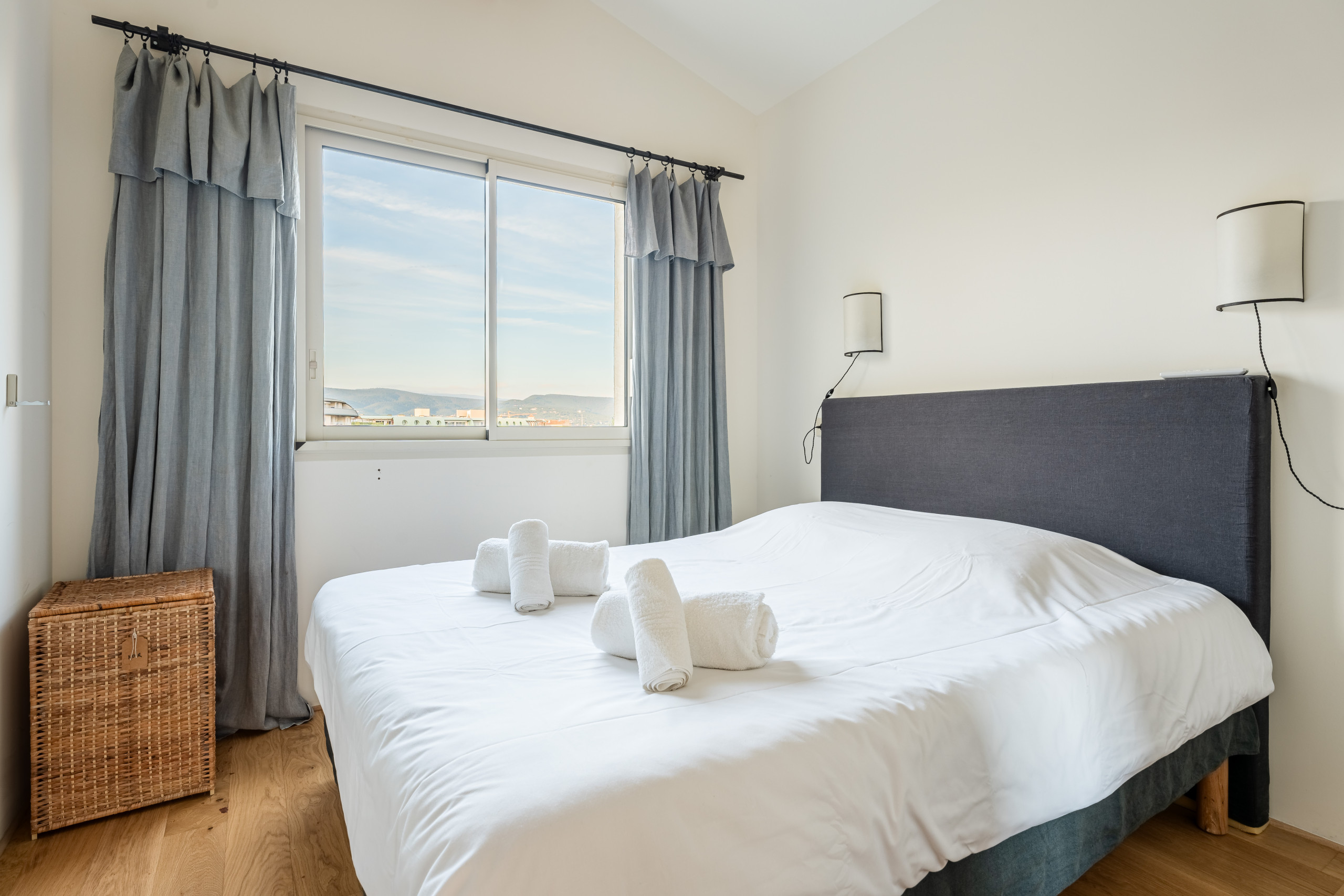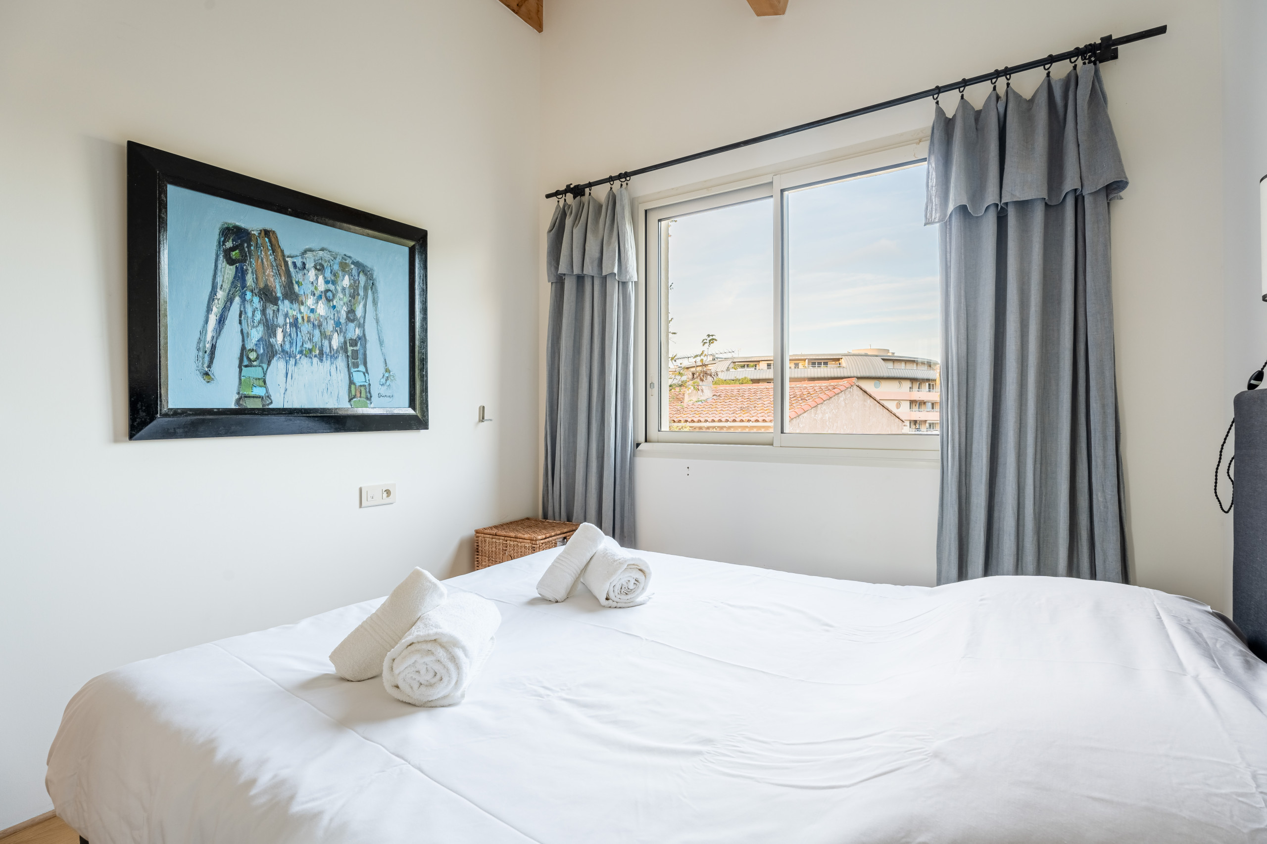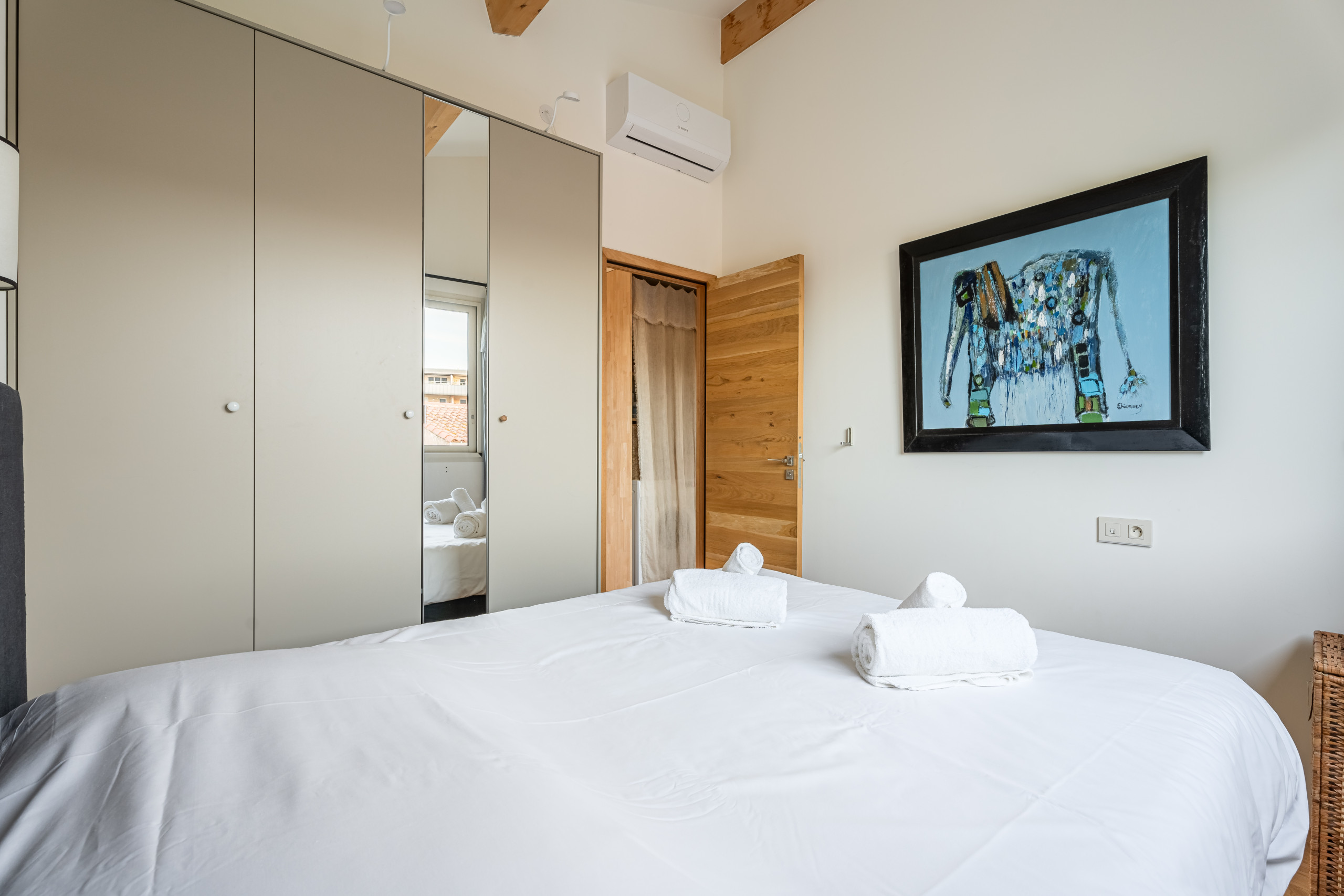 Il est séparé de la pièce de vie par un petit couloir qui dessert les 2 chambres climatisées et lumineuses avec leur grande fenêtre à la vue dominante sur la vieille ville ciotadenne. Elles sont équipées d’une literie récente et de qualité. L’une avec un lit double de160x200 et la seconde de 2 lits simples de 80x200 que l’on peut regrouper à la demande. Chaque chambre à son meuble dressing.