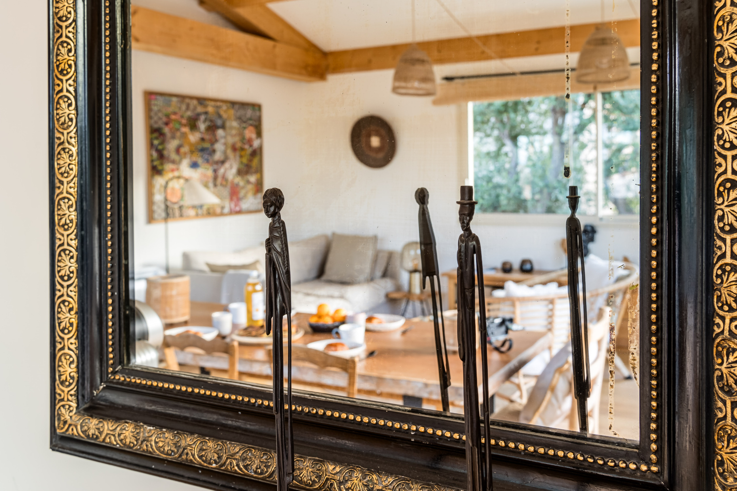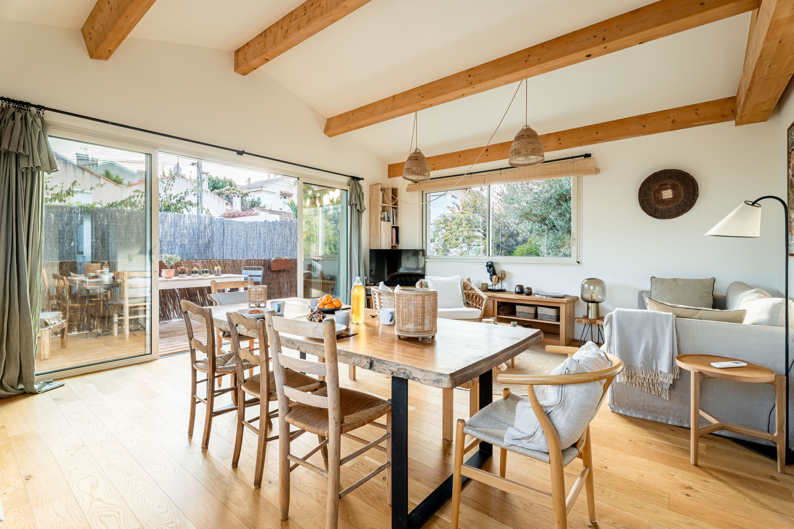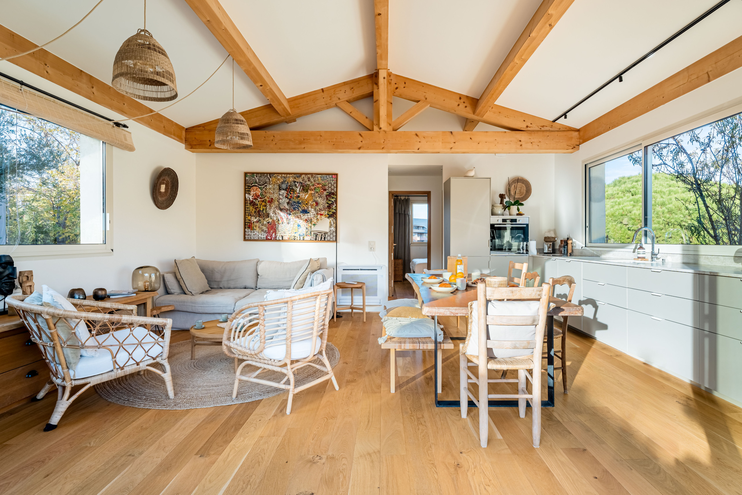 La pièce de vie est très agréable au quotidien avec une décoration élégante, moderne et réchauffée par la présence du bois. La qualité des matériaux est aussi appréciable comme par exemple la table en bois massif et acier, la qualité du mobilier de cuisine. L’ensemble offre un certain standing que vous saurez apprécier.