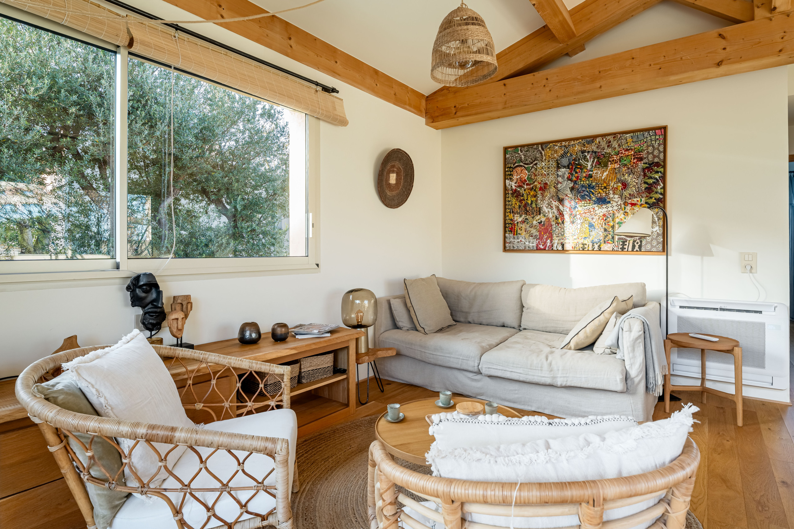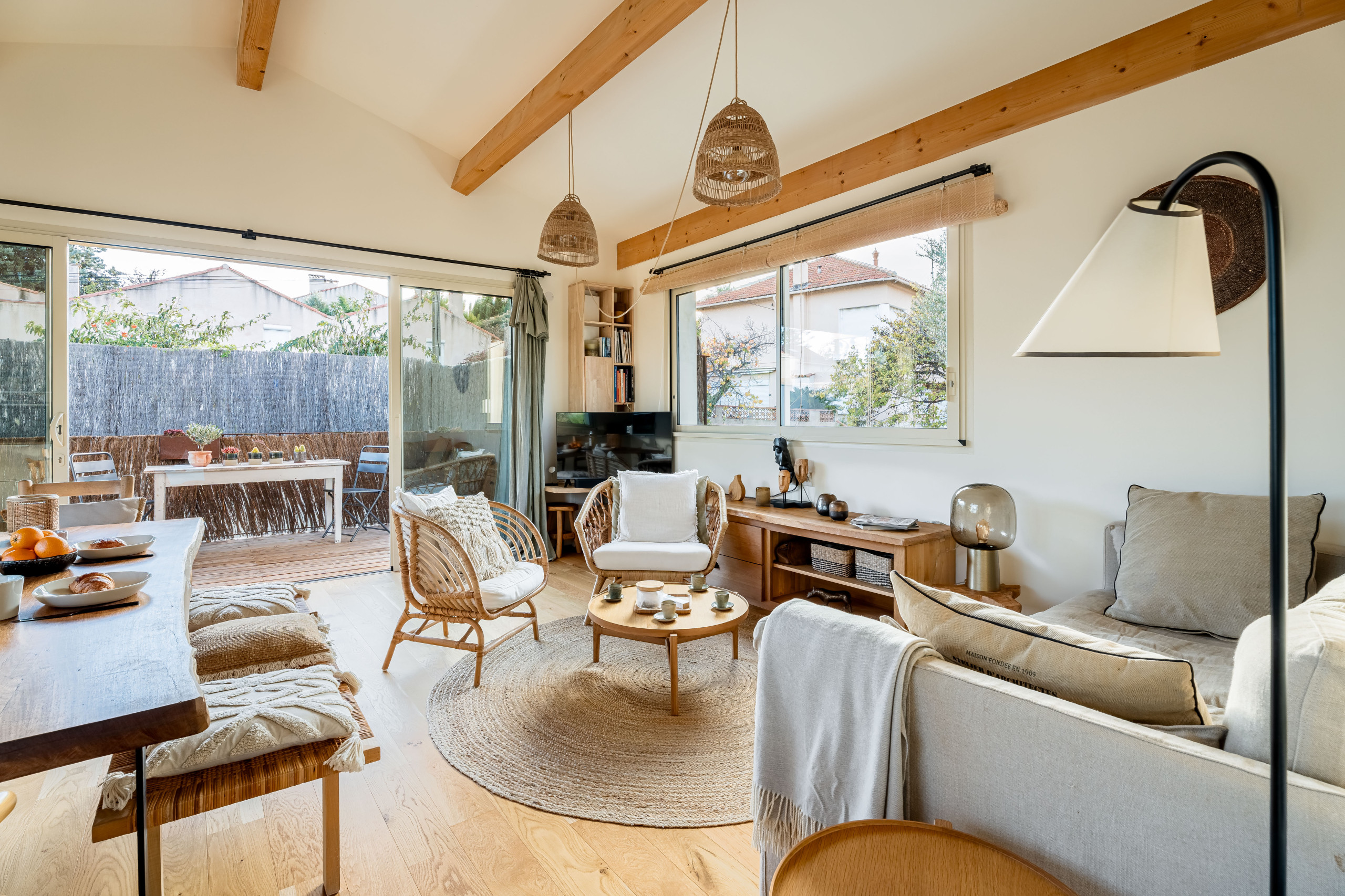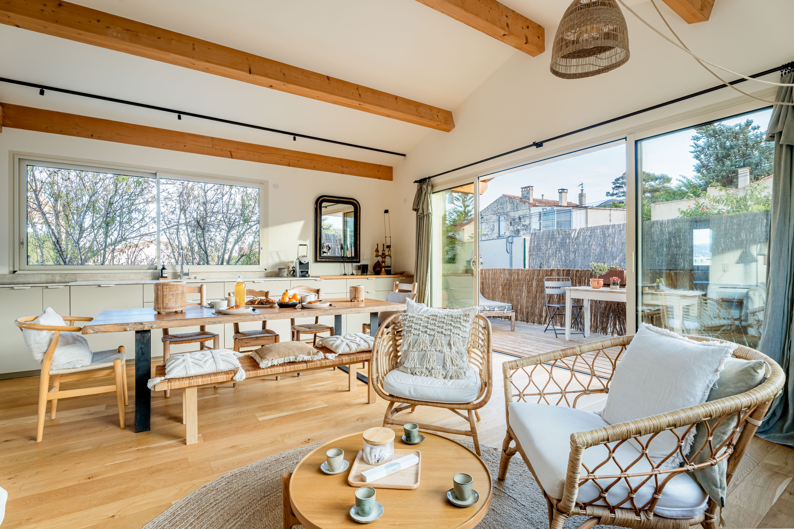 La pièce principale est composée de 3 zones avec sa cuisine ouverte sur l’espace repas et son coin salon très confortable. De toute part vous aurez une vue vers l’extérieur et la terrasse, véritable prolongement de cet espace avec sa table de repas extérieur, sa plancha et sa chaise longue. C’est un ensemble très convivial.