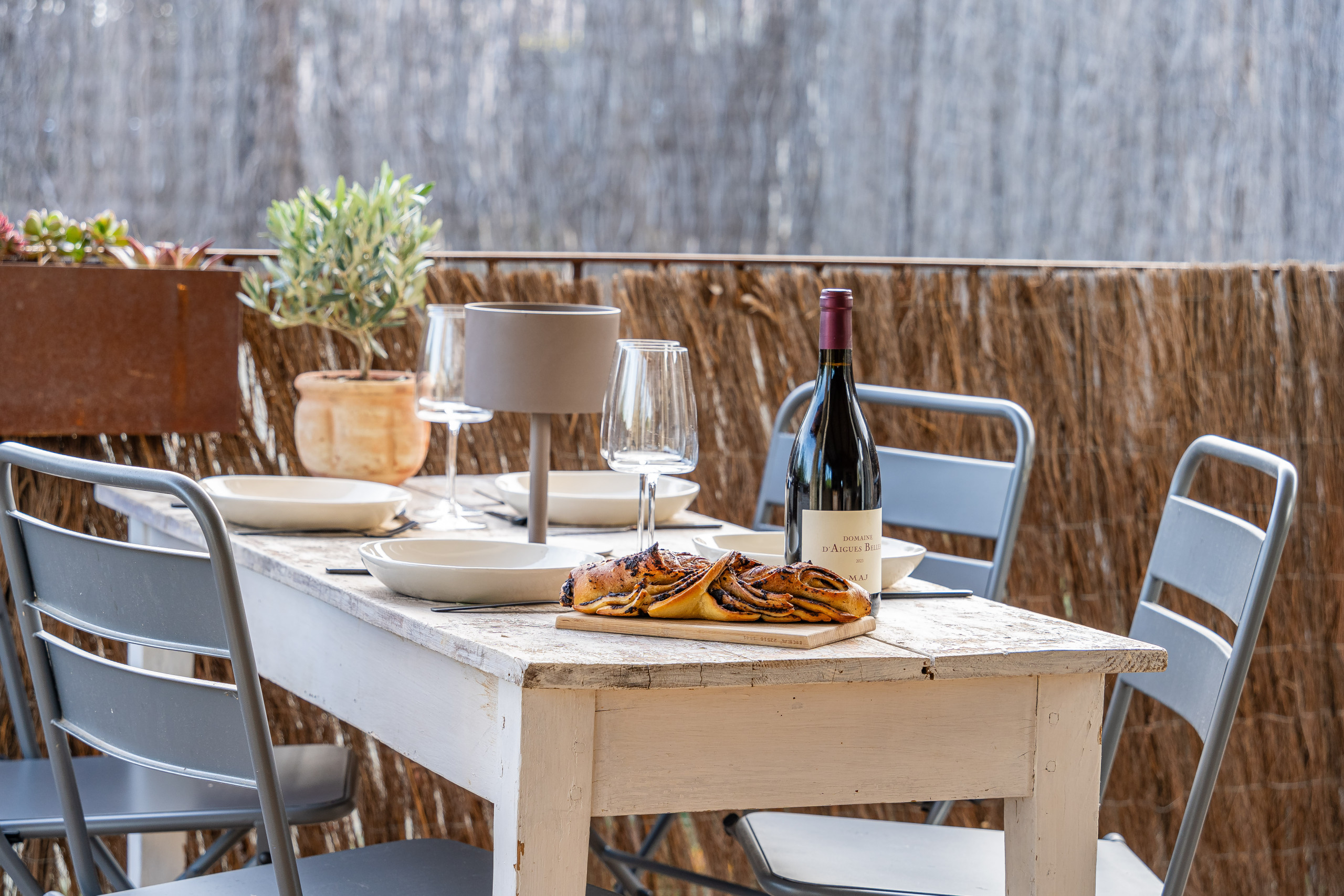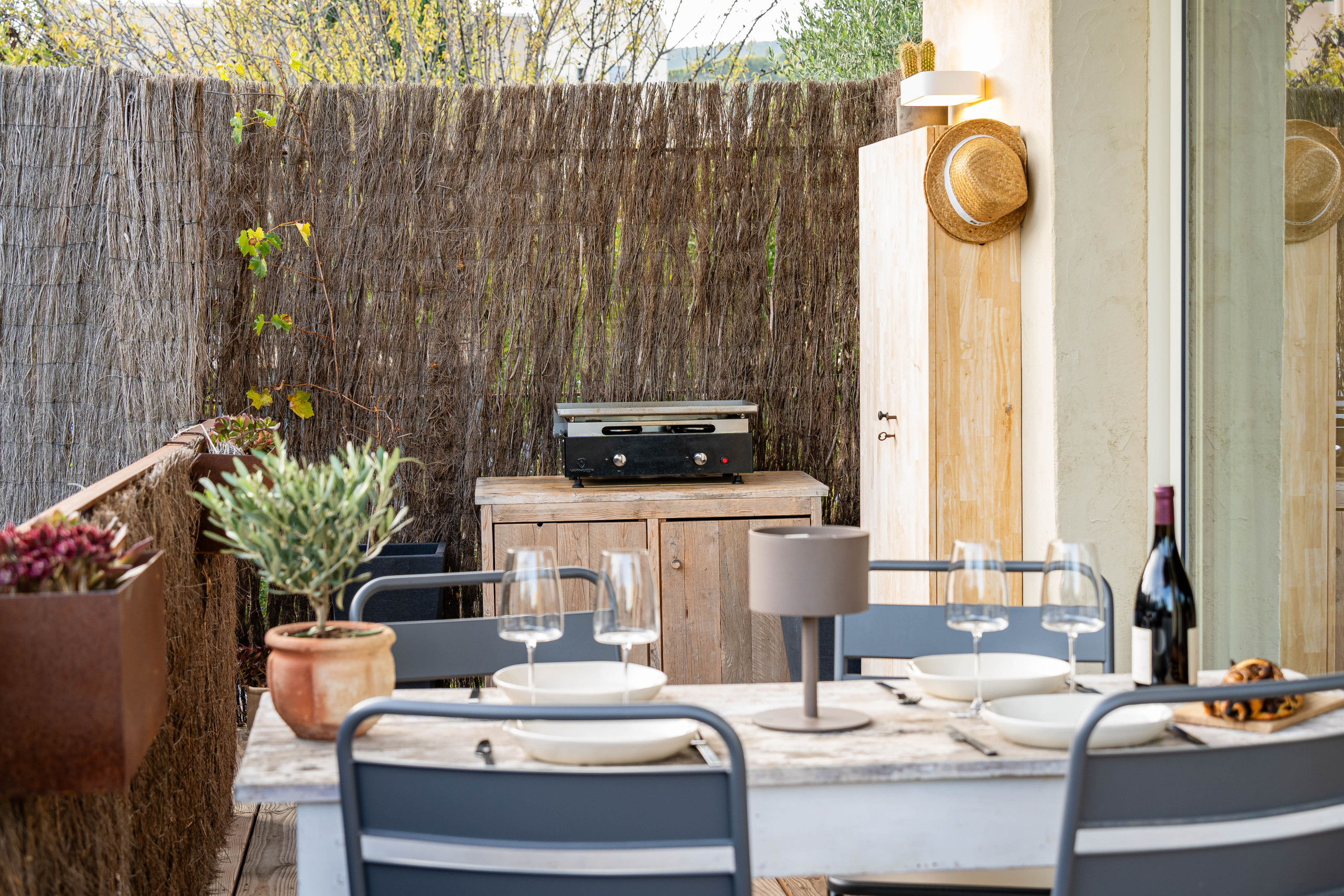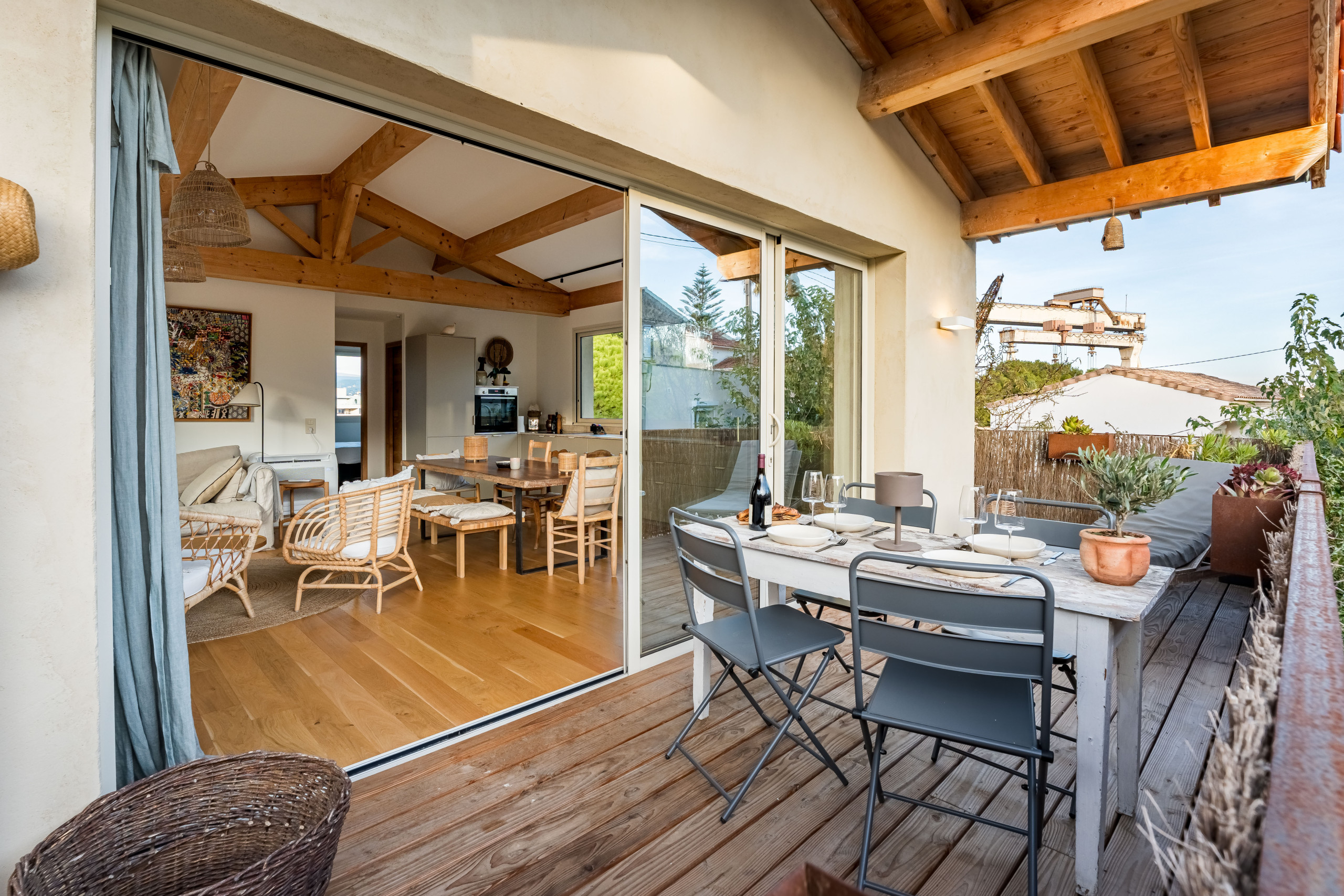La pièce principale est composée de 3 zones avec sa cuisine ouverte sur l’espace repas et son coin salon très confortable. De toute part vous aurez une vue vers l’extérieur et la terrasse, véritable prolongement de cet espace avec sa table de repas extérieur, sa plancha et sa chaise longue. C’est un ensemble très convivial.