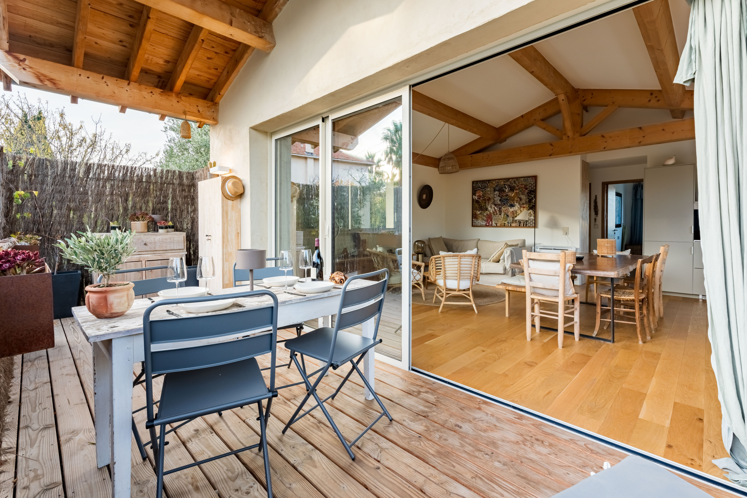 Il est incontestablement pour la pièce de vie exceptionnellement lumineuse et tournée vers l’extérieur avec sa triple exposition, ses très grandes fenêtres coulissantes et sa quadruple baie vitrée. Une fois ouverte, celle-ci vous donné accès à la terrasse qui devient une extension de la pièce de vie. Elle offre aussi une vue mer.
