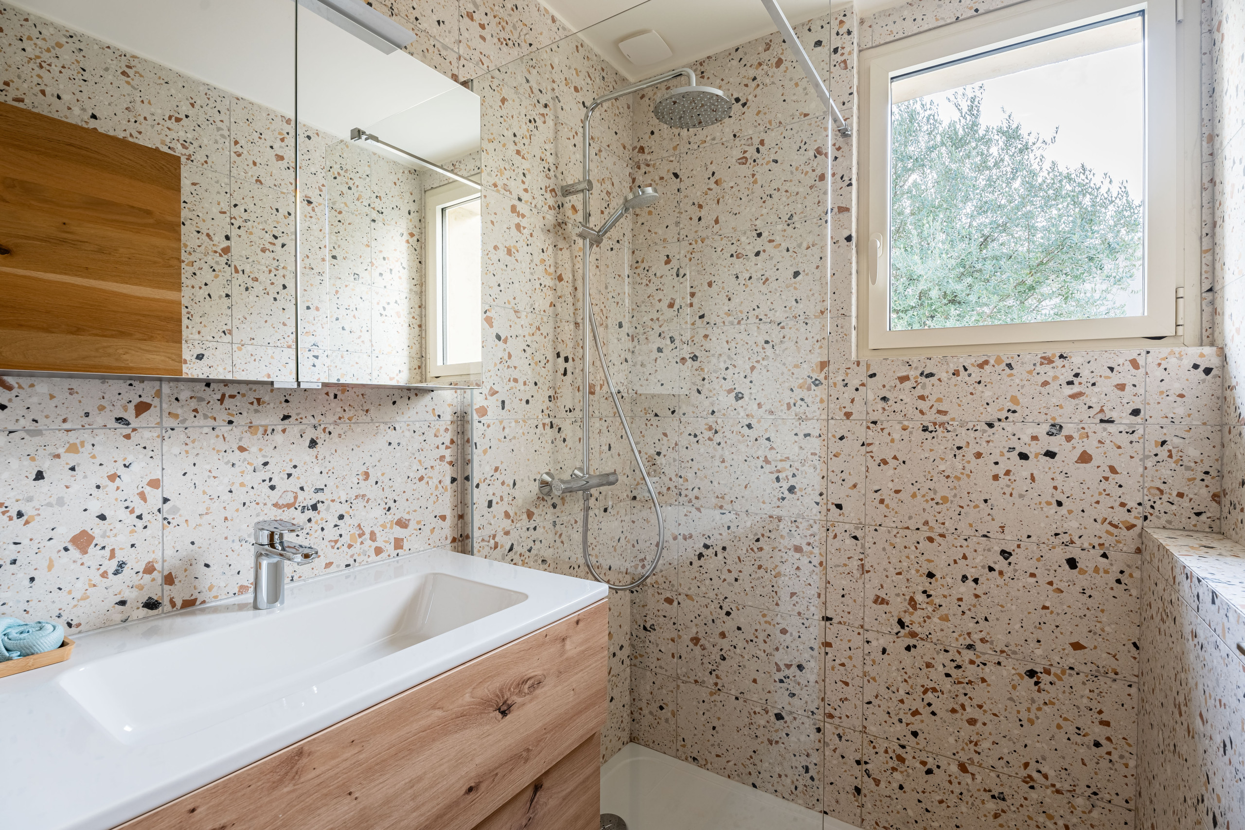 La salle d'eau est partagée pour les deux chambres. Elle est très agréable avec une grande douche italienne et son carrelage aspect terrazzo.