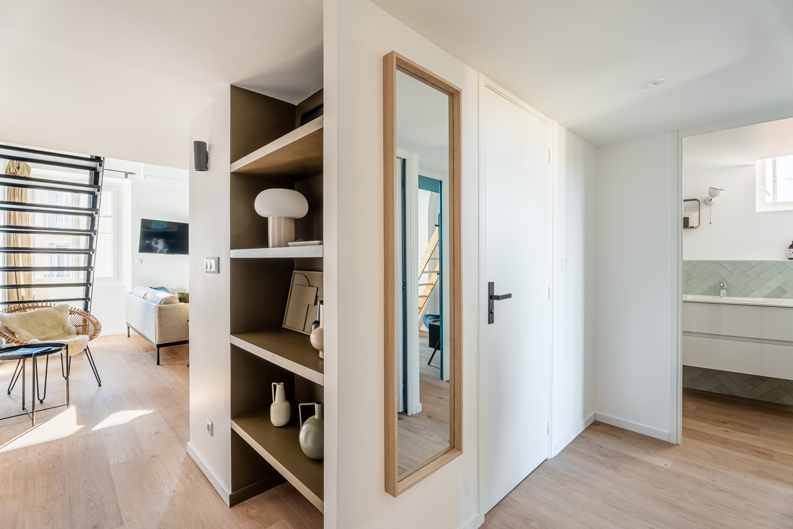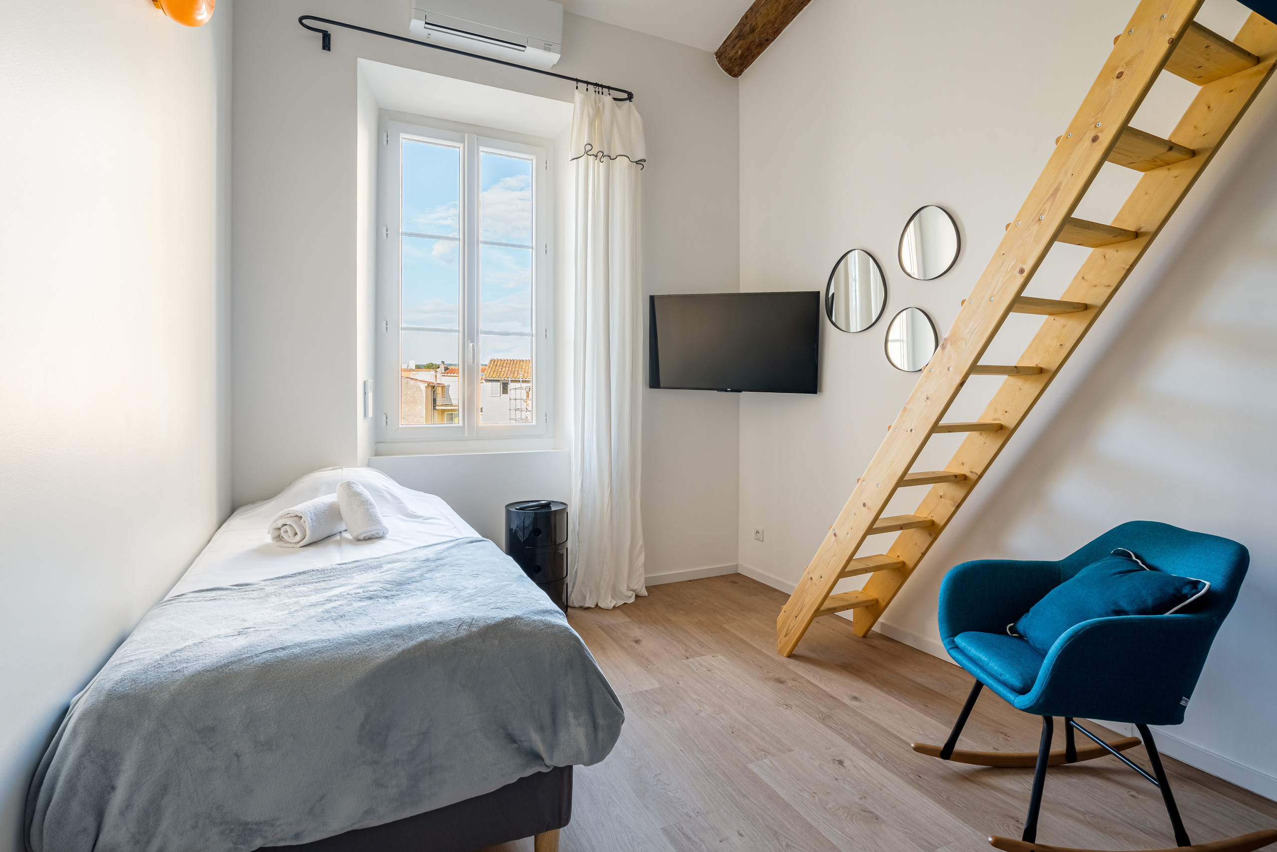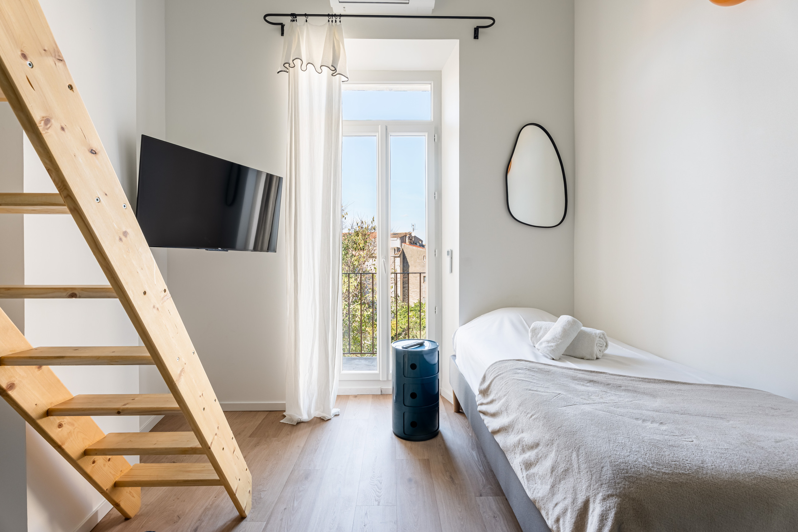 Les deux autres chambres en duplex se situent à l’arrière de l’appartement. Elles sont lumineuses et offrent une jolie vue dégagée. L’une d’entre elles a un accès balcon avec une porte fenêtre.