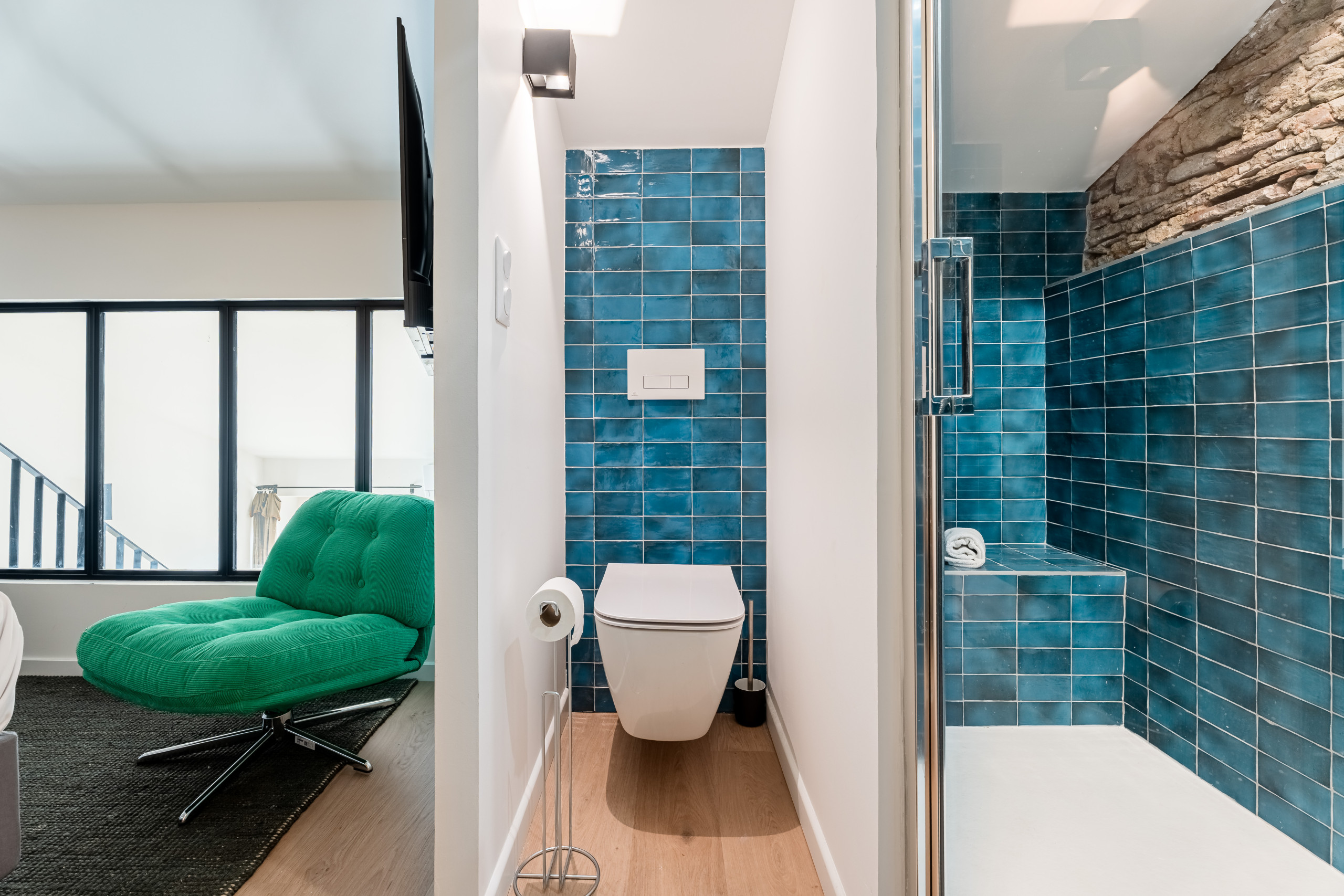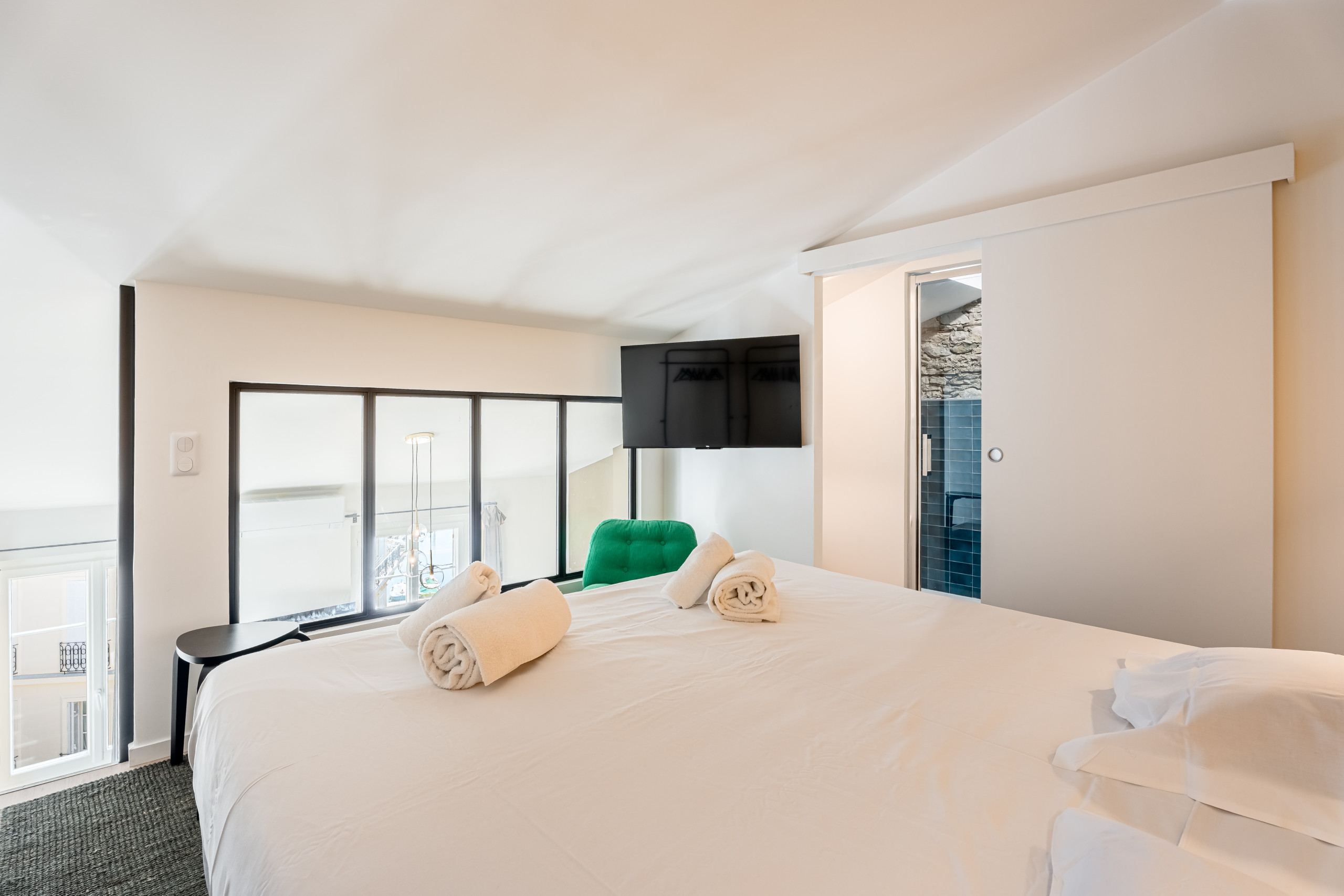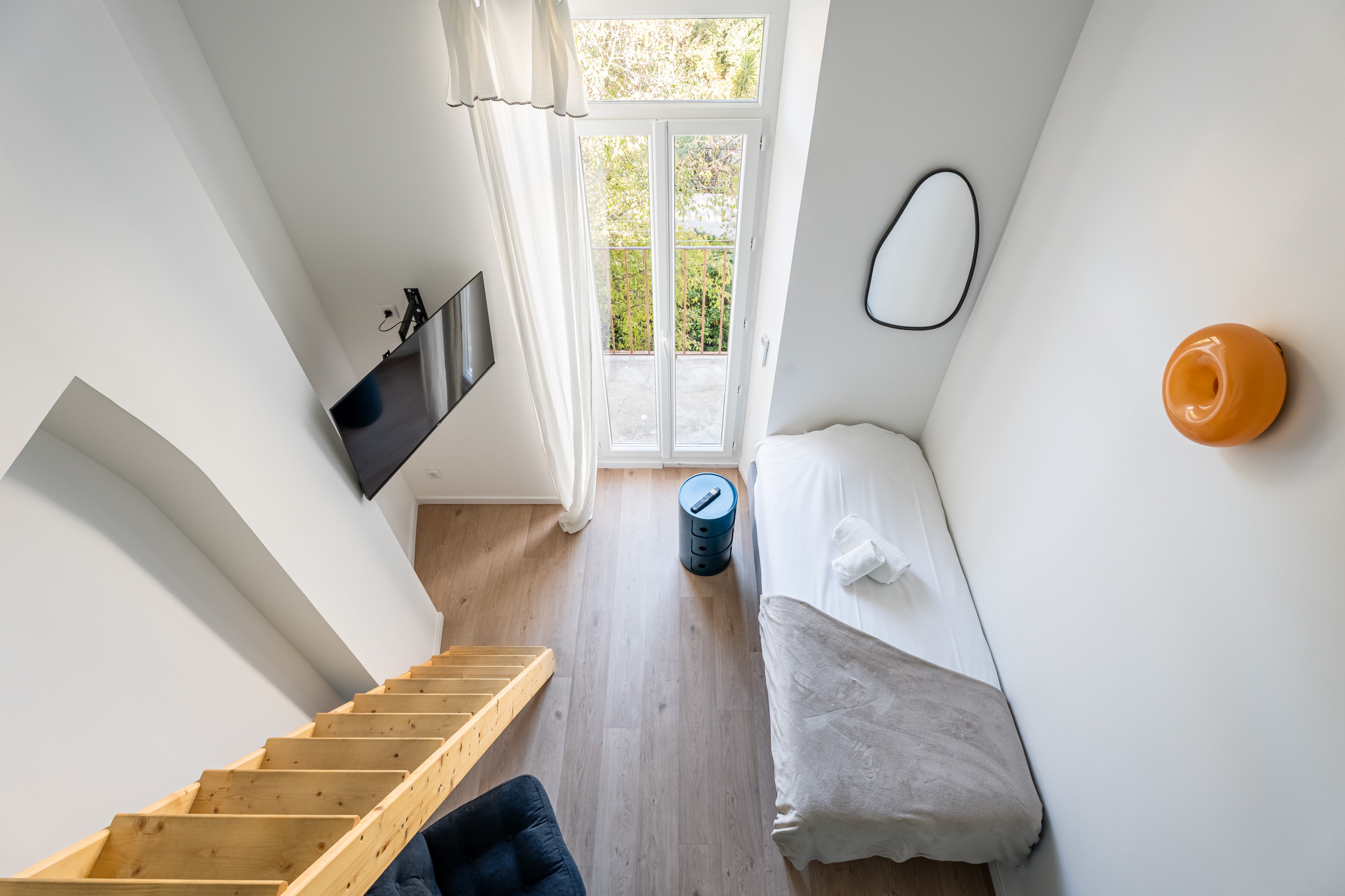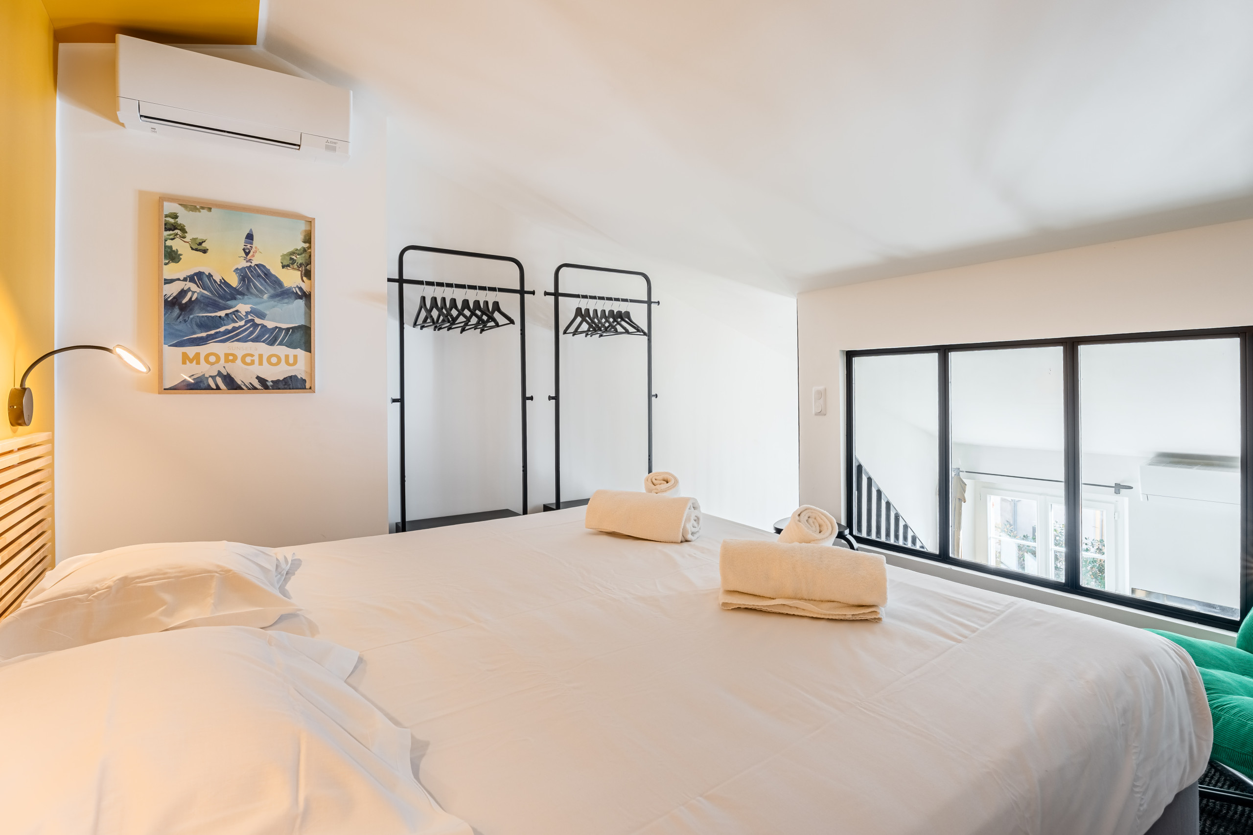 Les deux autres chambres en duplex se situent à l’arrière de l’appartement. Elles sont lumineuses et offrent une jolie vue dégagée. L’une d’entre elles a un accès balcon avec une porte fenêtre.