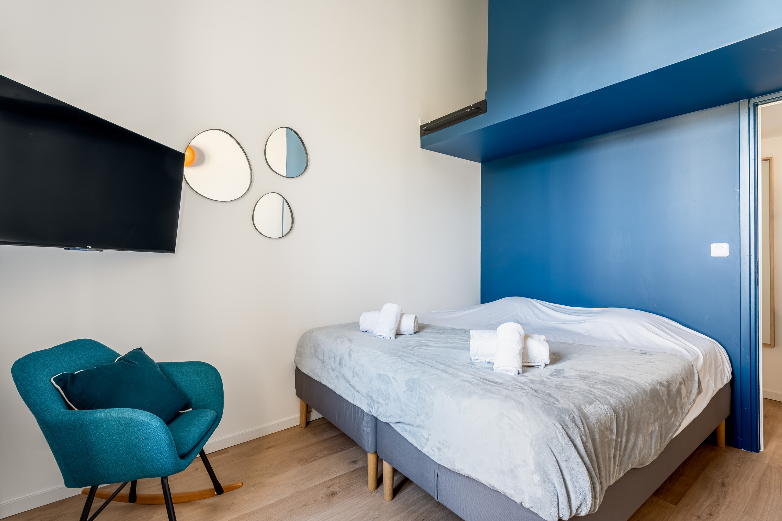 La décoration moderne et raffinée s’appuie sur un doux équilibre entre le bois, l’acier et des couleurs reposantes. Il se dégage un esprit, une ambiance cosy que vous saurez apprécier pour vous délasser.