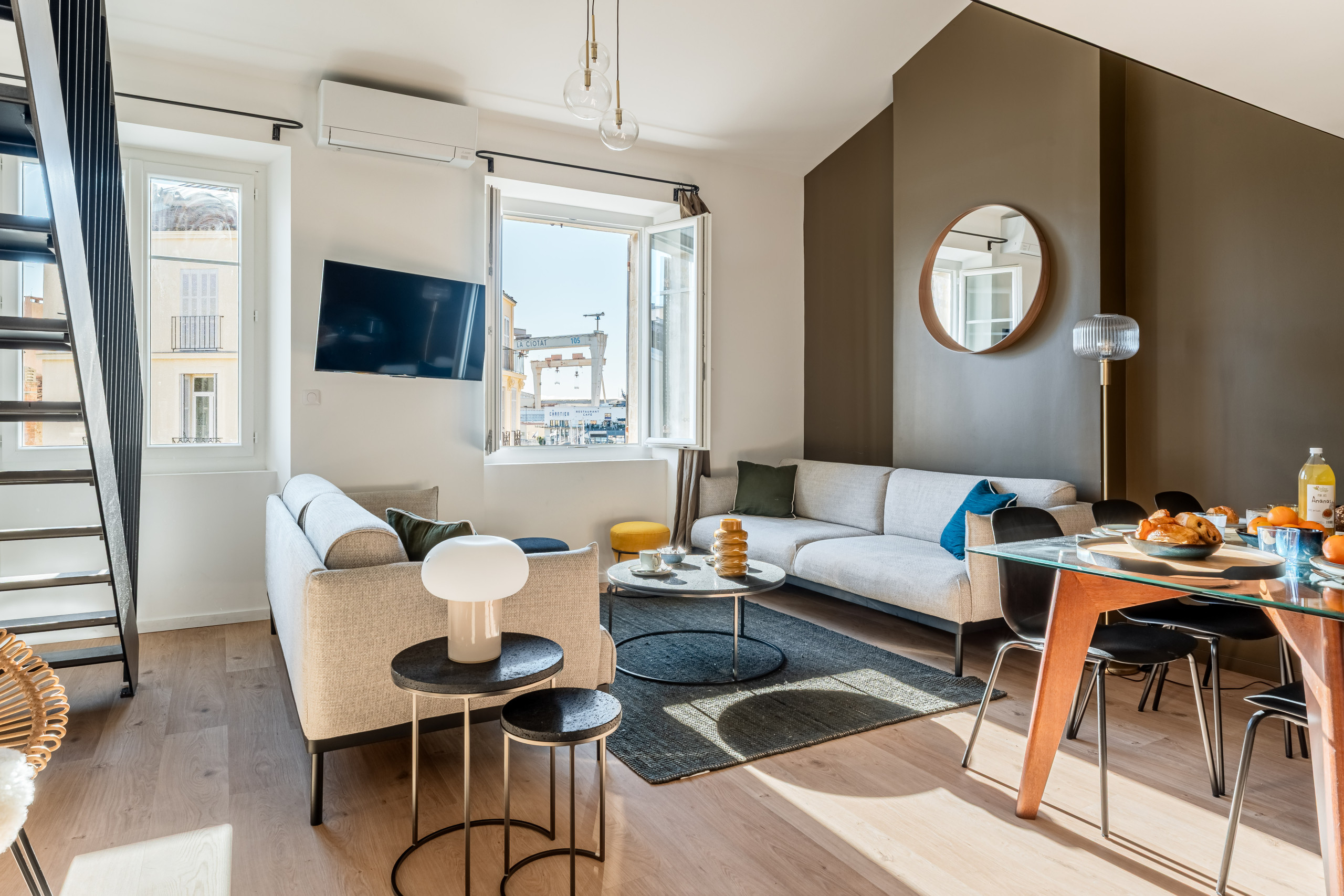 Il est incontestablement pour la pièce de vie avec son volume sous plafond généreux, sa magnifique vue sur le port, son mobilier design et confortable qui offre un espace très agréable à vivre.