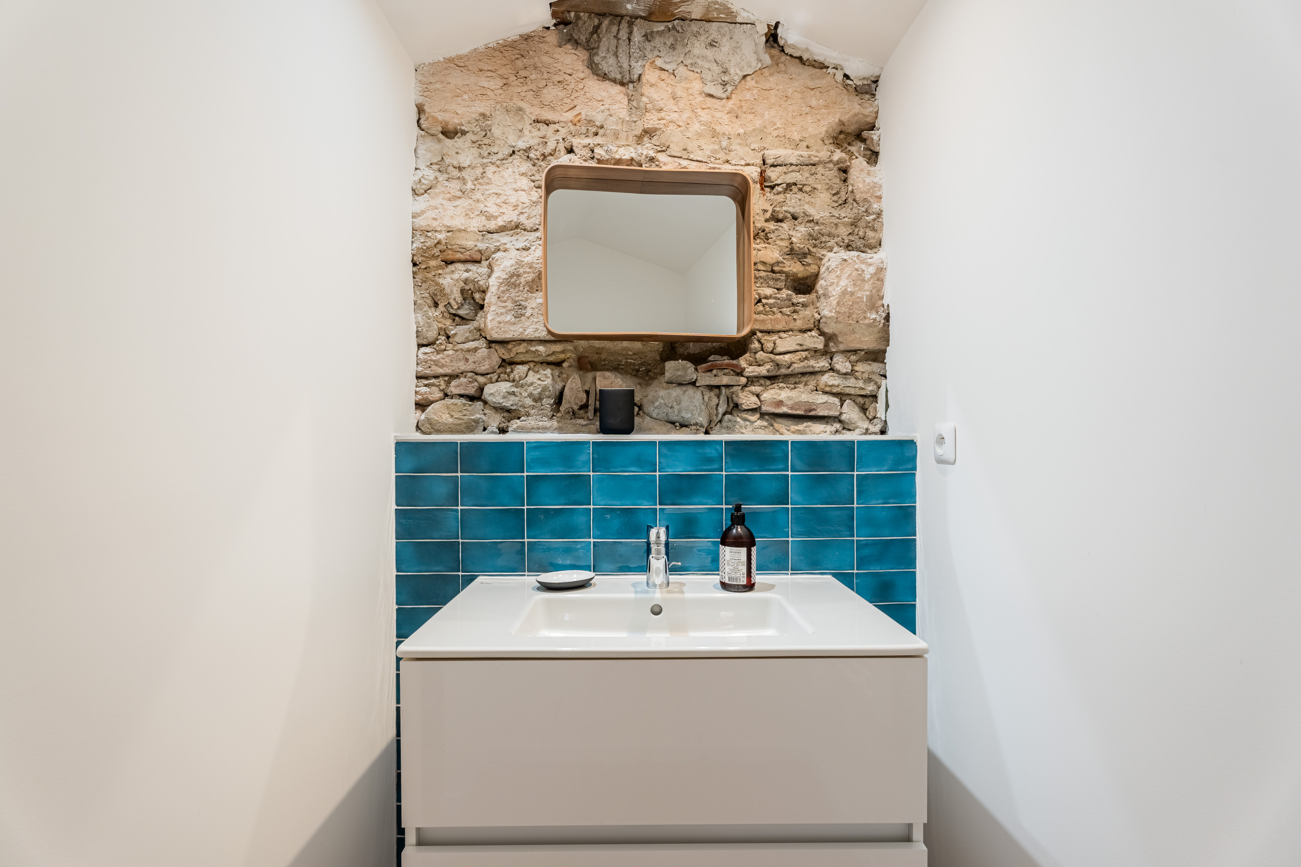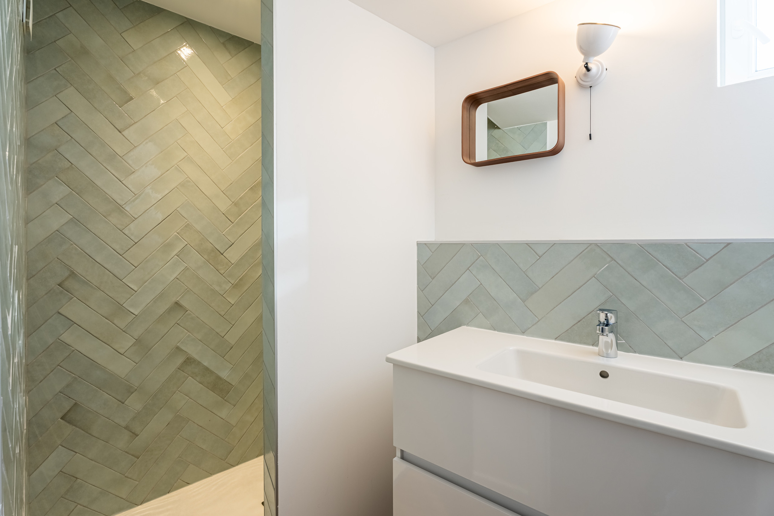 La seconde salle de bain avec vasque et douche à l’italienne se situe à proximité des deux chambres.