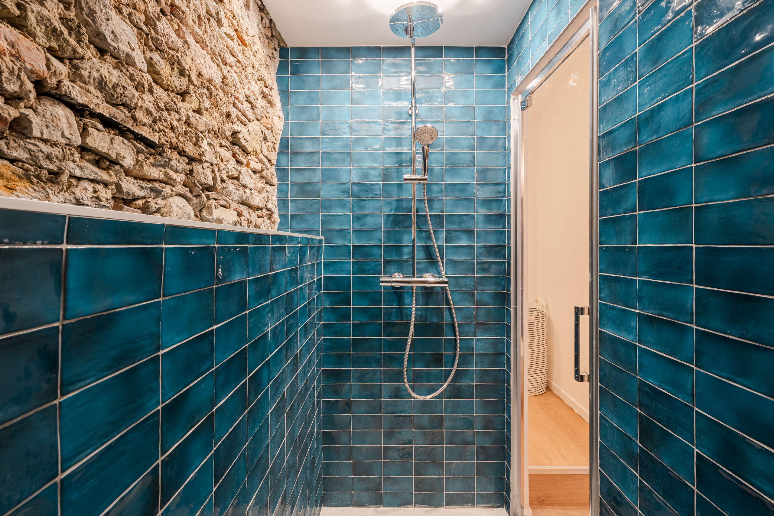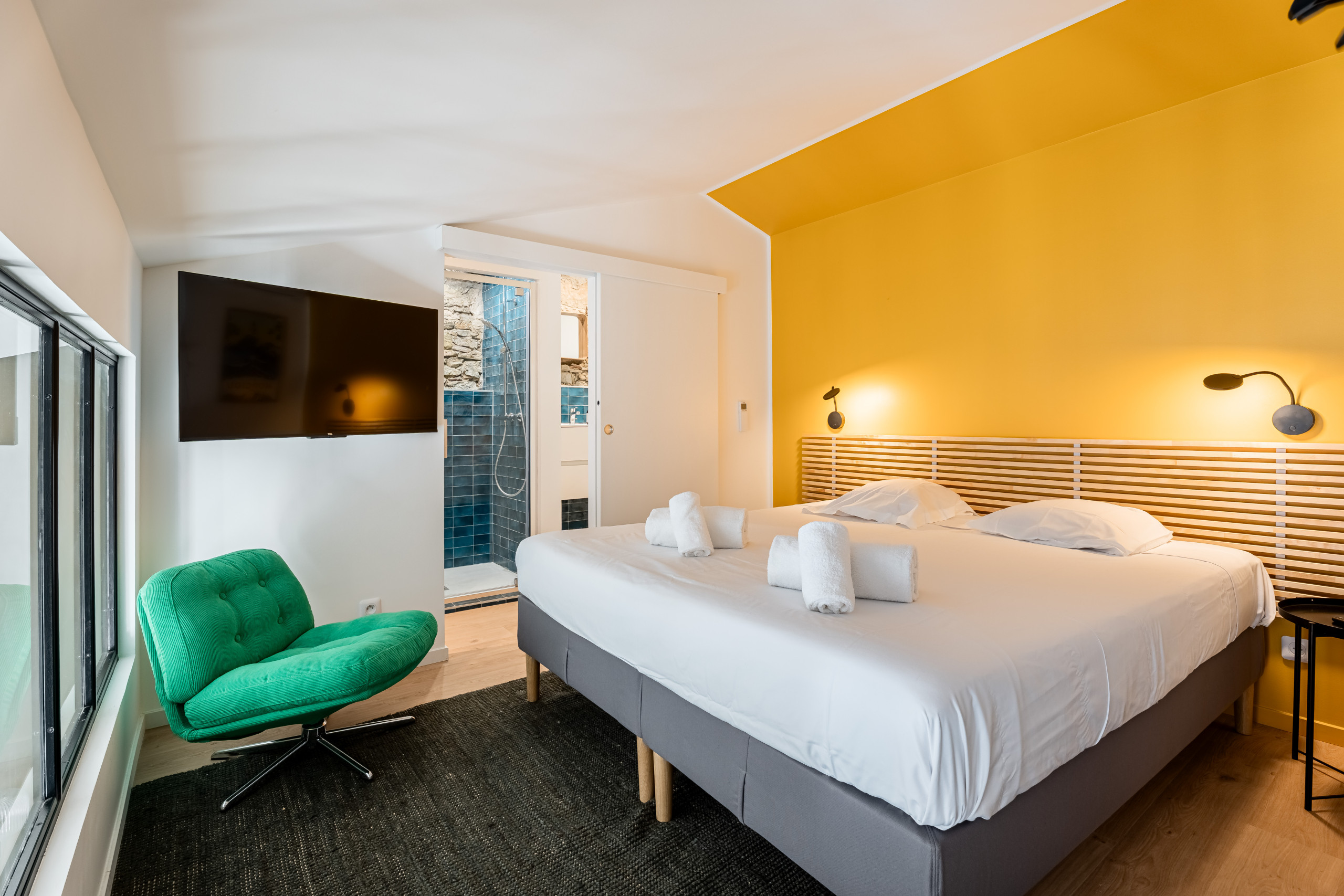La suite parentale en mezzanine est un véritable cocon à la décoration tendance mixant Zélige, pierre apparente, couleurs chaleureuses, bois. Elle est équipée d’un lit double confortable, une télévision, une penderie et une salle de bain avec douche italienne, vasque et WC.
