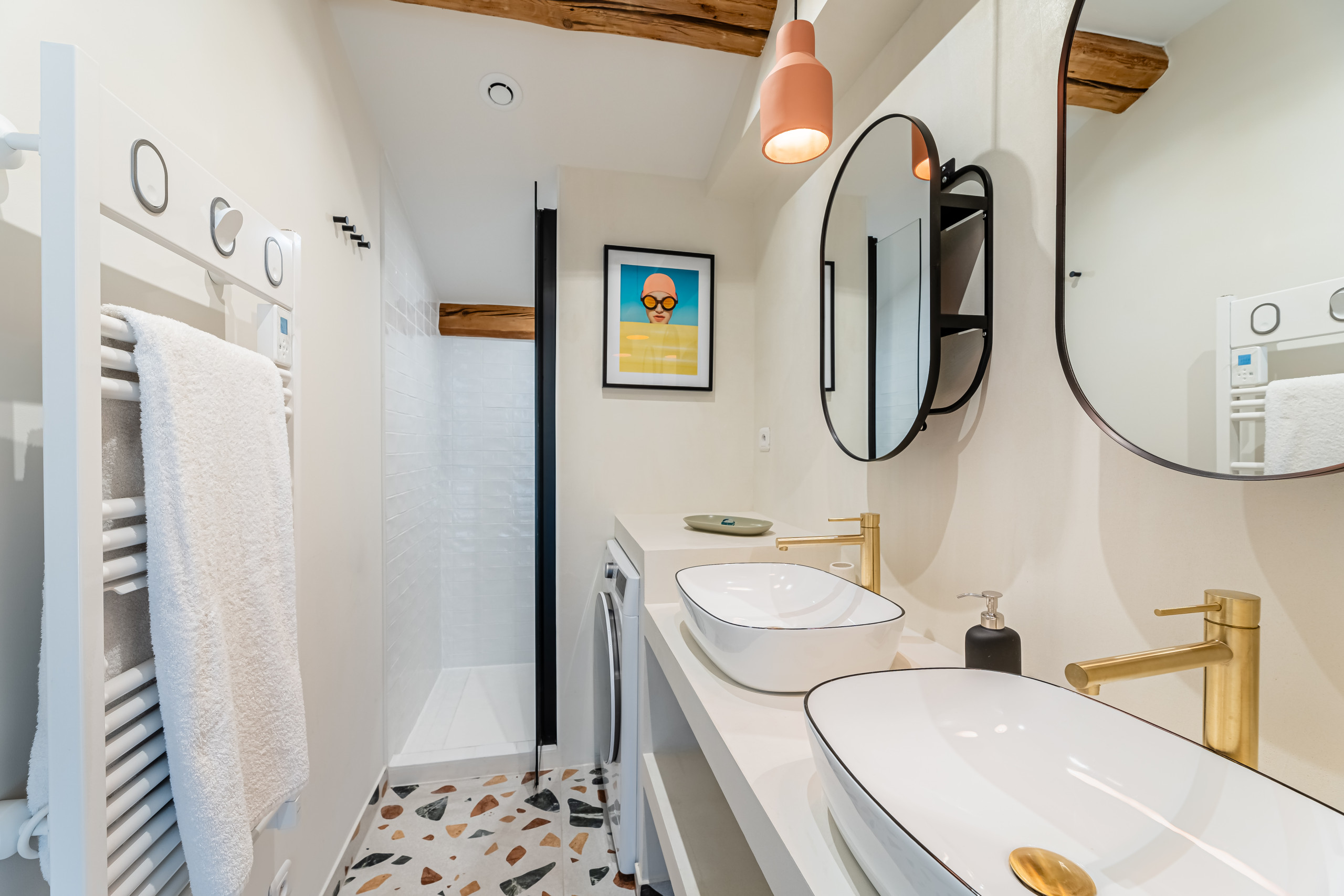 La seconde salle d’eau avec double vasque est aussi à ce niveau. Elle intègre le lave-linge/sèche-linge.