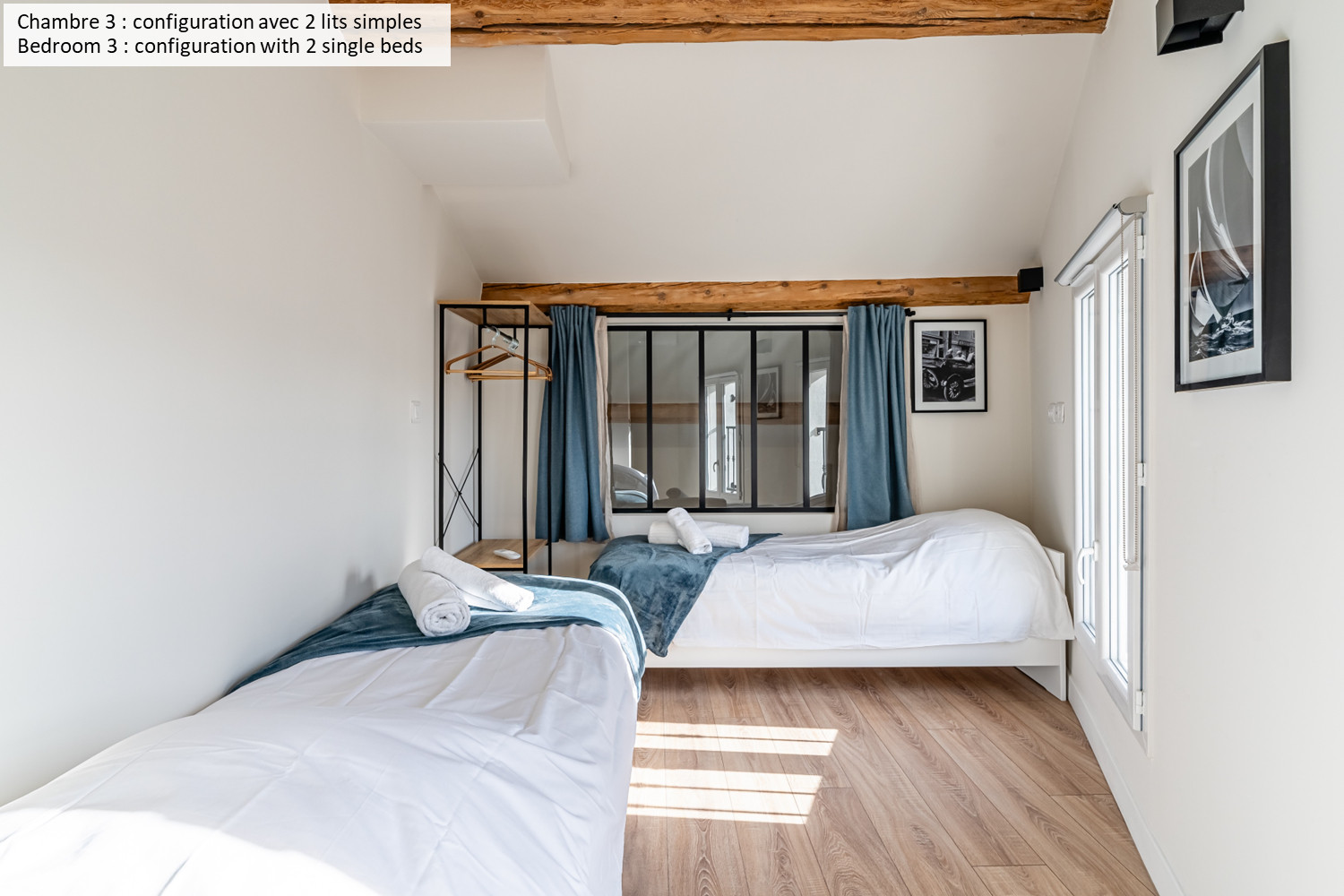 Les 3 chambres climatisées sont réparties sur les 2 étages. Toutes offrent une literie à ressort de qualité et récente. Chaque chambre propose deux lits simples que nous pouvons regrouper en lit double avec surmatelas à la demande. Les volets et rideaux sont occultants.