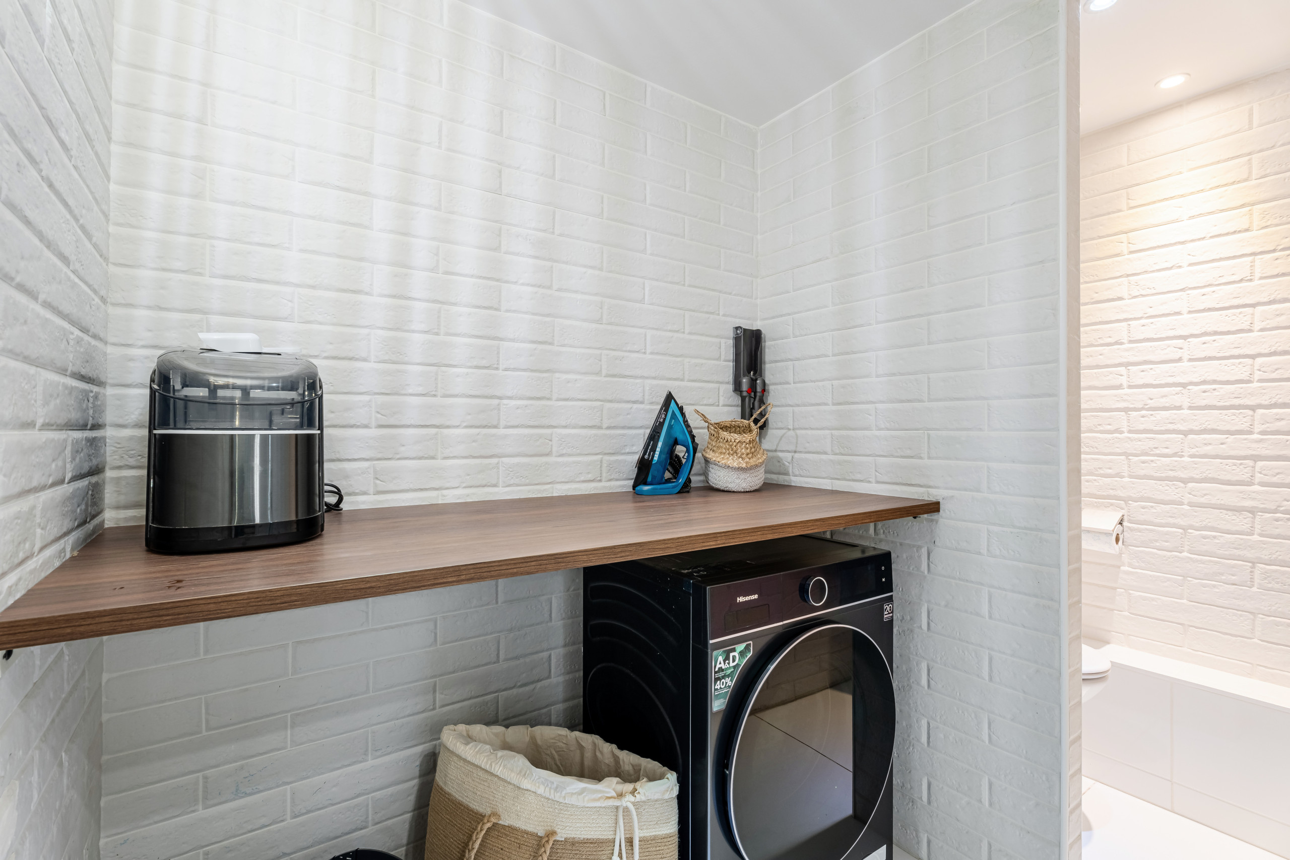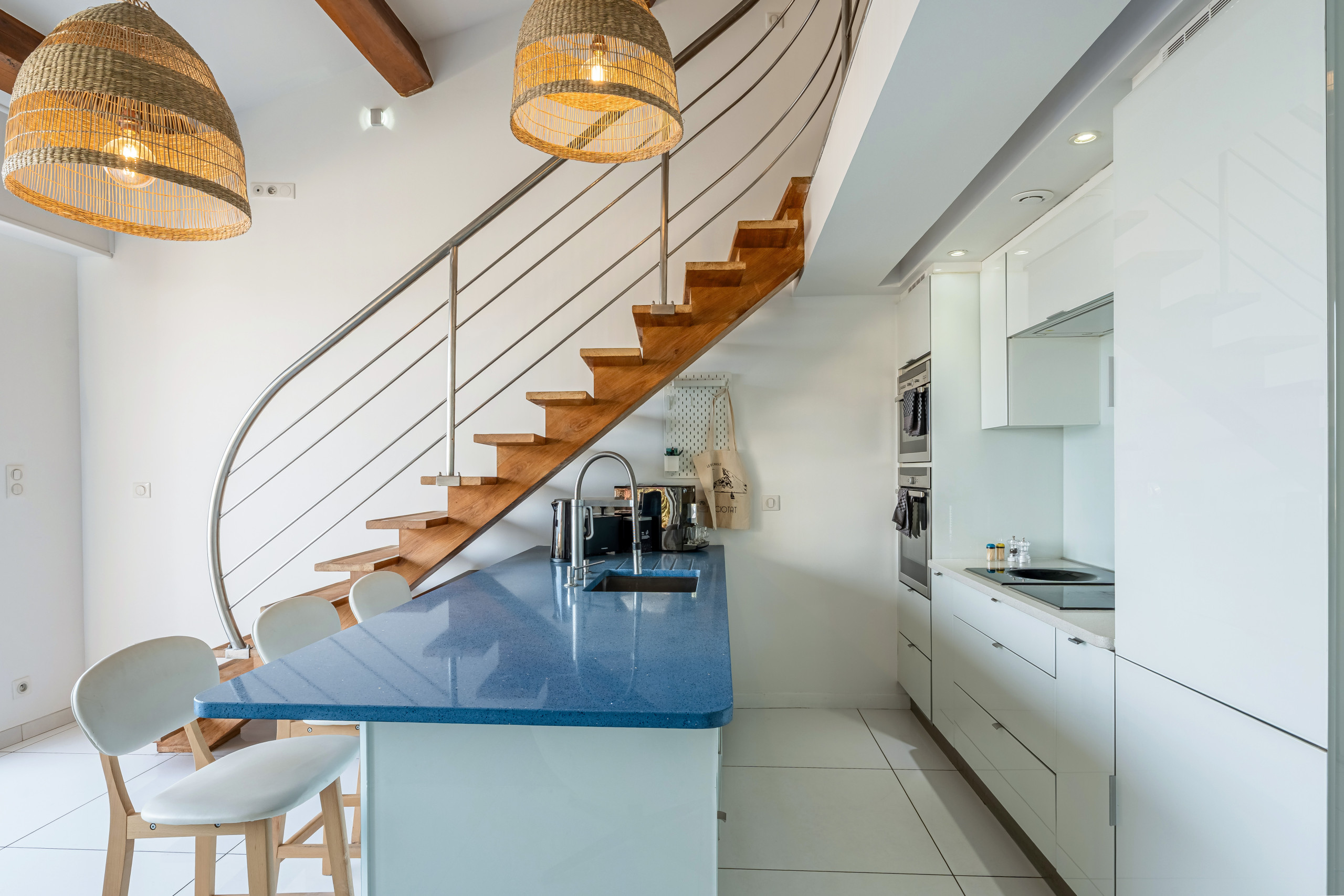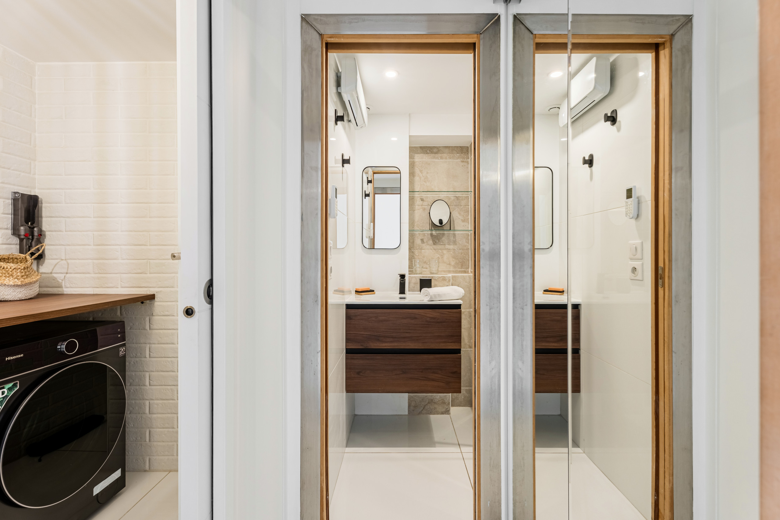 L’appartement est notamment équipé d’une machine à laver/séchante, lave-vaisselle, cafetière Nespresso, bouilloire, grille-pain, micro-onde.