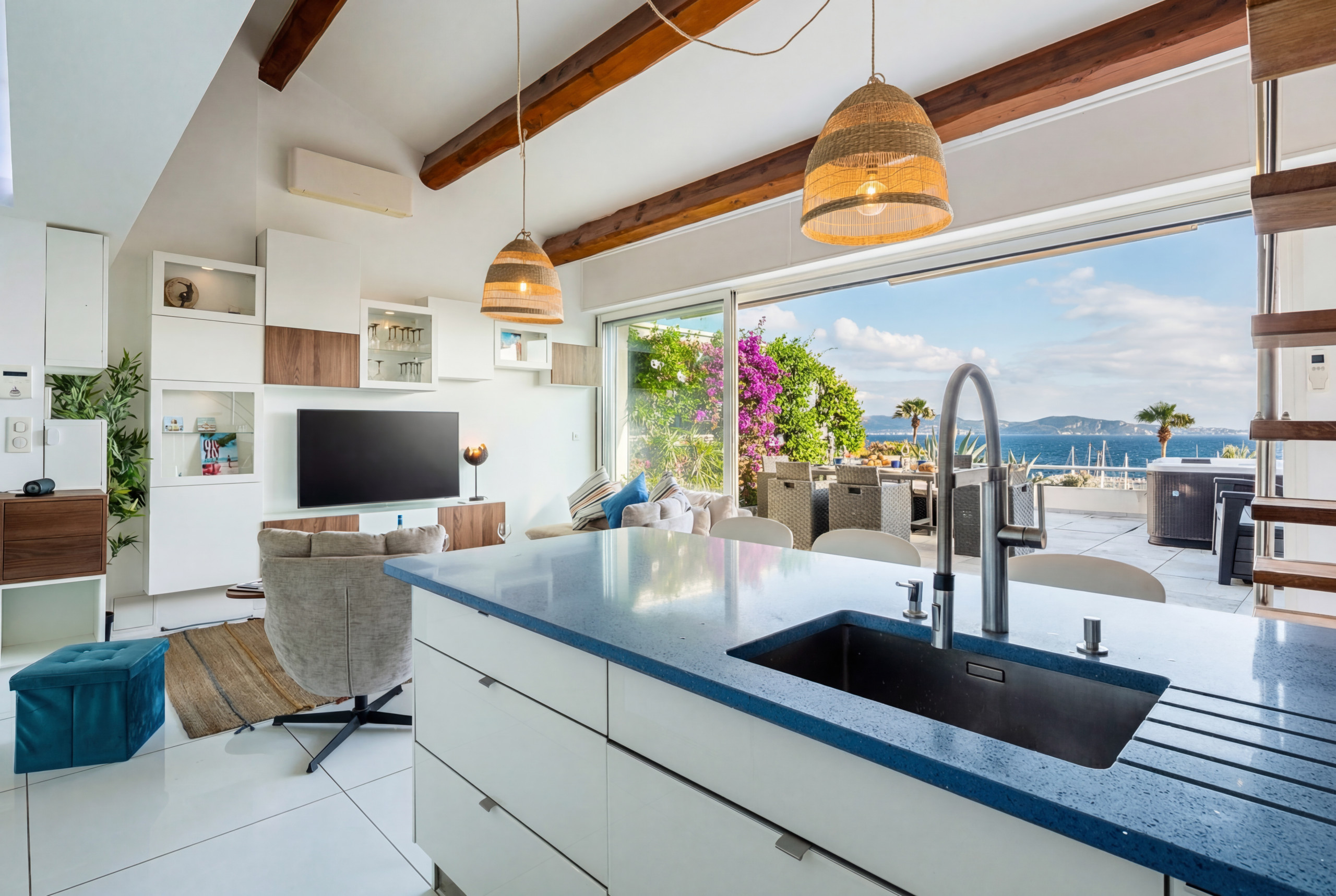 La pièce de vie avec son volume sous plafond généreux en duplex, baignée de lumière avec la grande double baie vitrée exposée sud-est avec un accès direct à la terrasse et toujours cette vue sur le port et la mer.