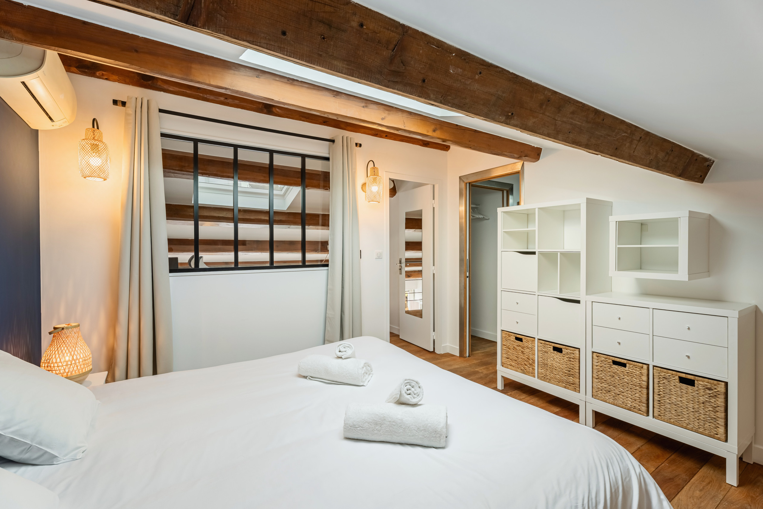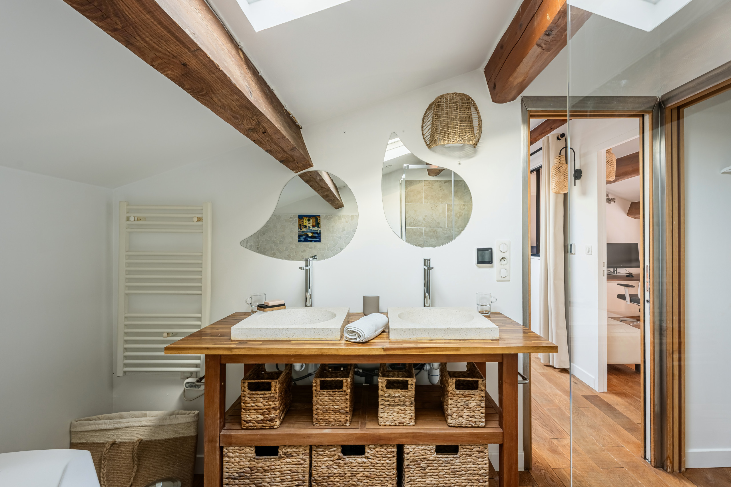 La suite parentale climatisée en mezzanine, sous toit. C’est un cocon à la décoration tendance mixant verrière industrielle, parquet massif, couleurs apaisantes. C’est aussi un espace particulièrement confortable avec sa surface, son dressing, sa salle de bain équipée d’une grande douche à l’italienne, d’une baignoire d’angle. Le water closet est séparé. Vous avez aussi un grand espace bureau pour 2 personnes en mezzanine donnant sur le salon.