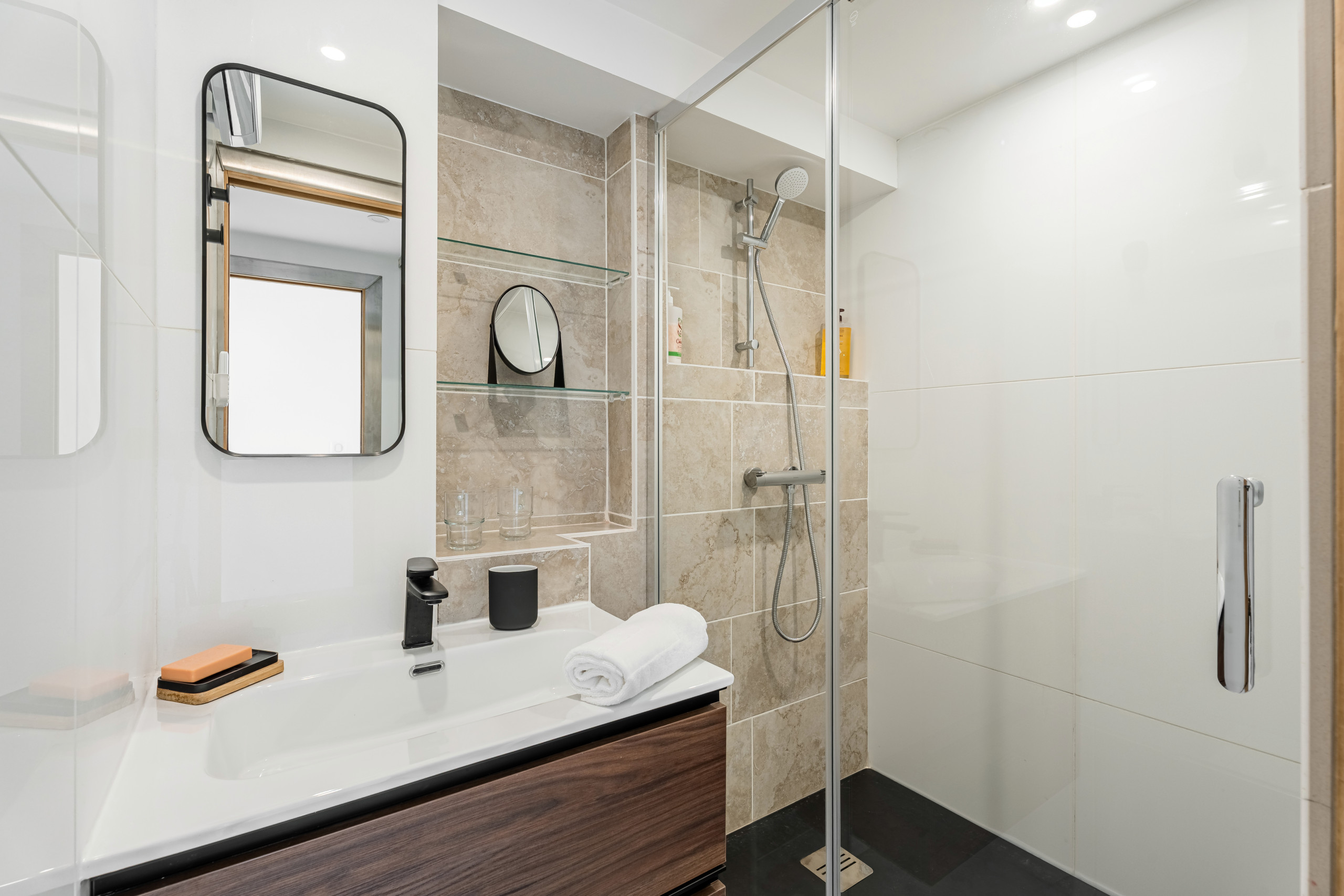 La seconde salle de bain avec vasque et douche à l’italienne se situe à proximité des deux chambres ainsi qu’un water closet séparé. Il est aussi facilement accessible depuis l’espace de vie et propose un espace buanderie séparé avec une machine à laver/séchante.