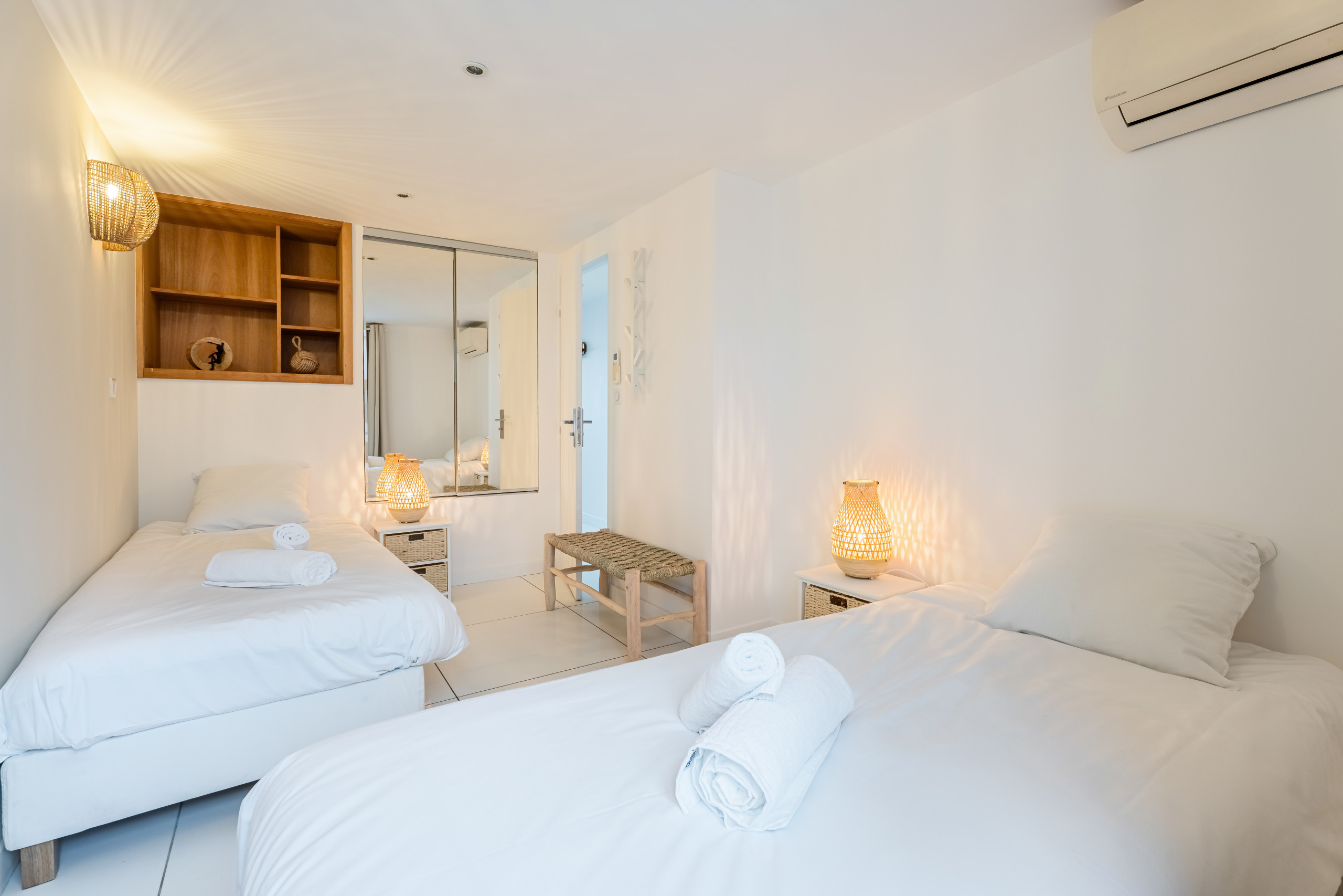 Pour que vous passiez de bonnes nuits, les chambres sont climatisées et équipées d’une literie récente et de qualité. Chaque chambre est équipée de 2 lits simples que l’on peut regrouper à la demande avec surmatelas pour votre confort.
