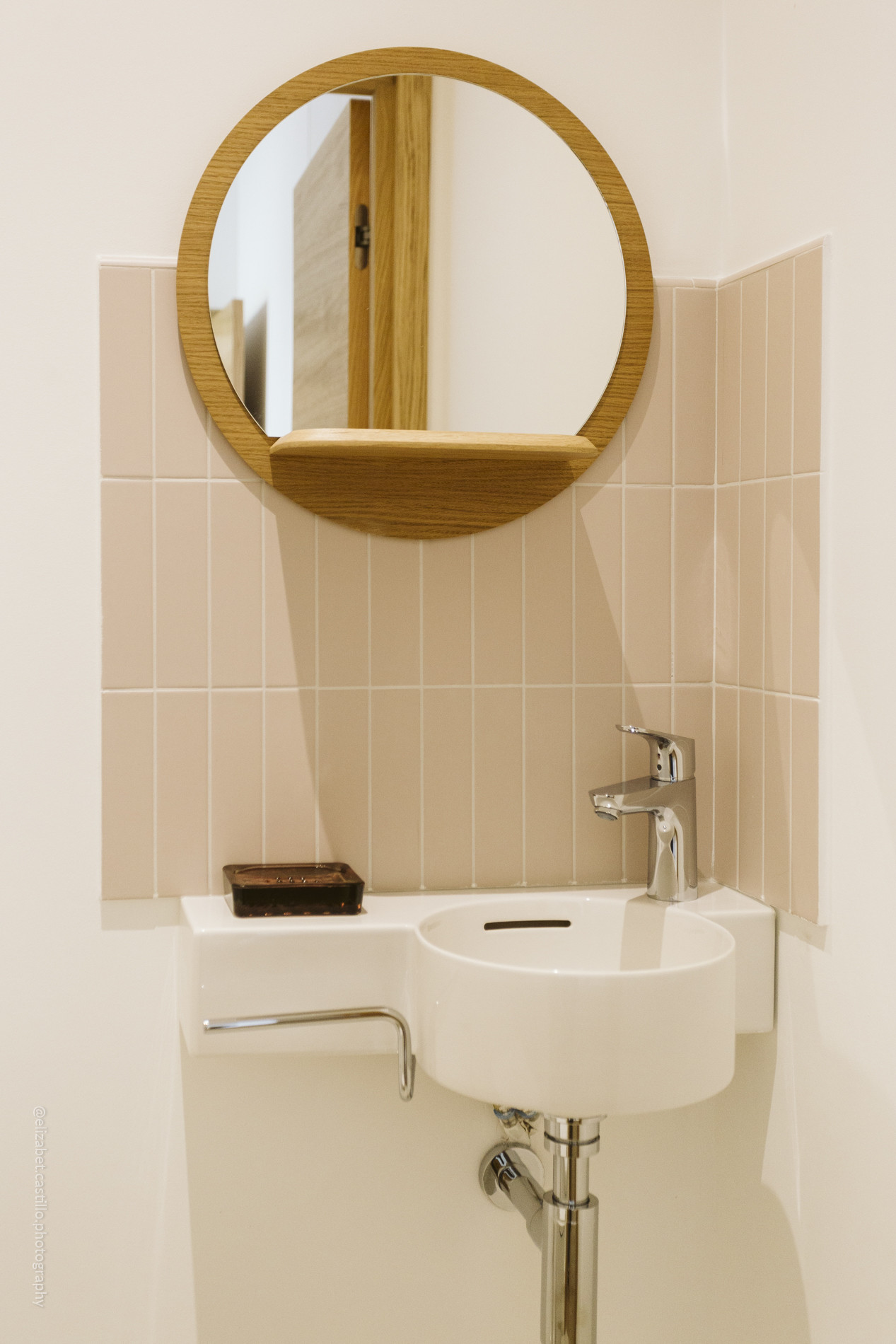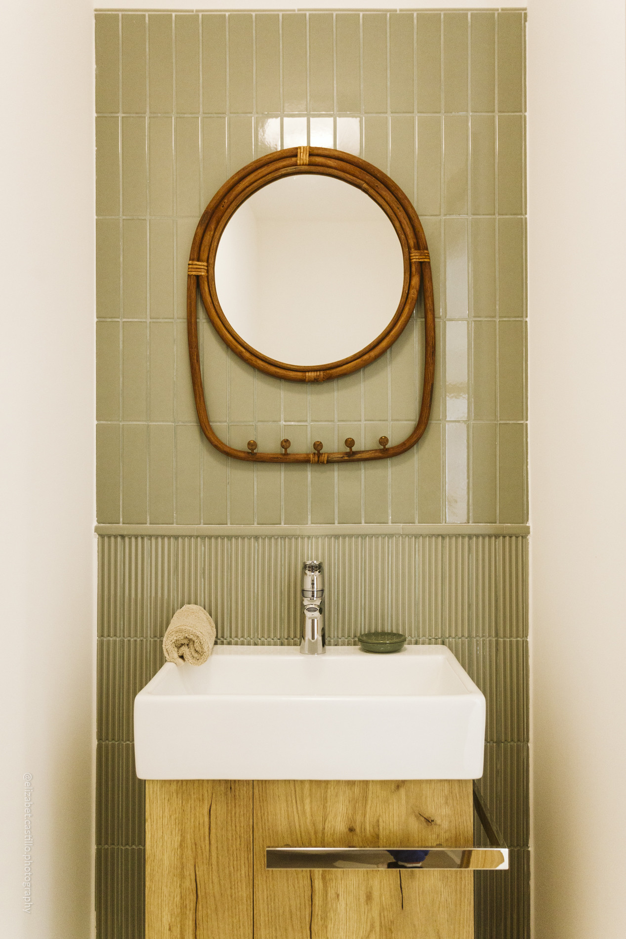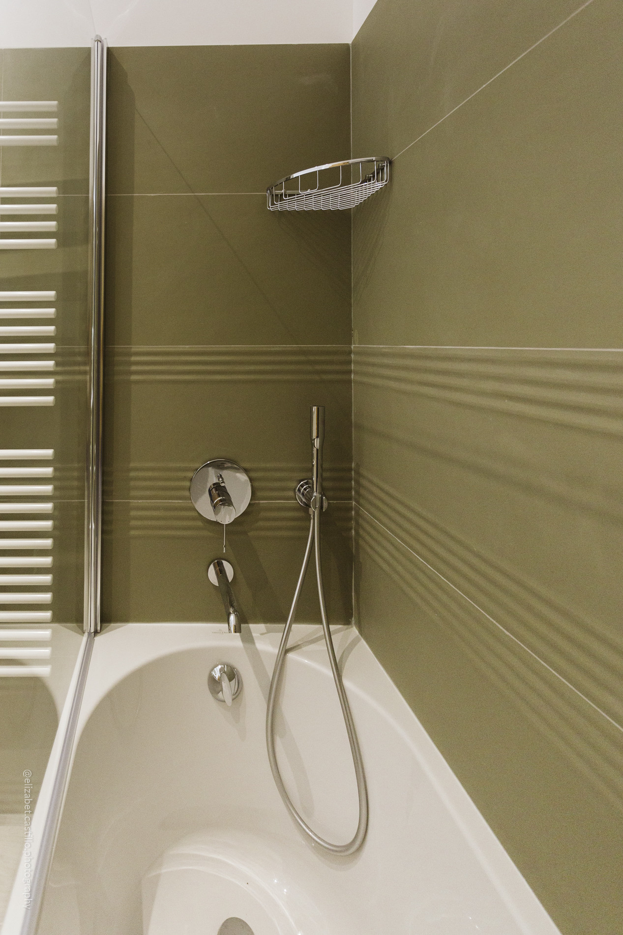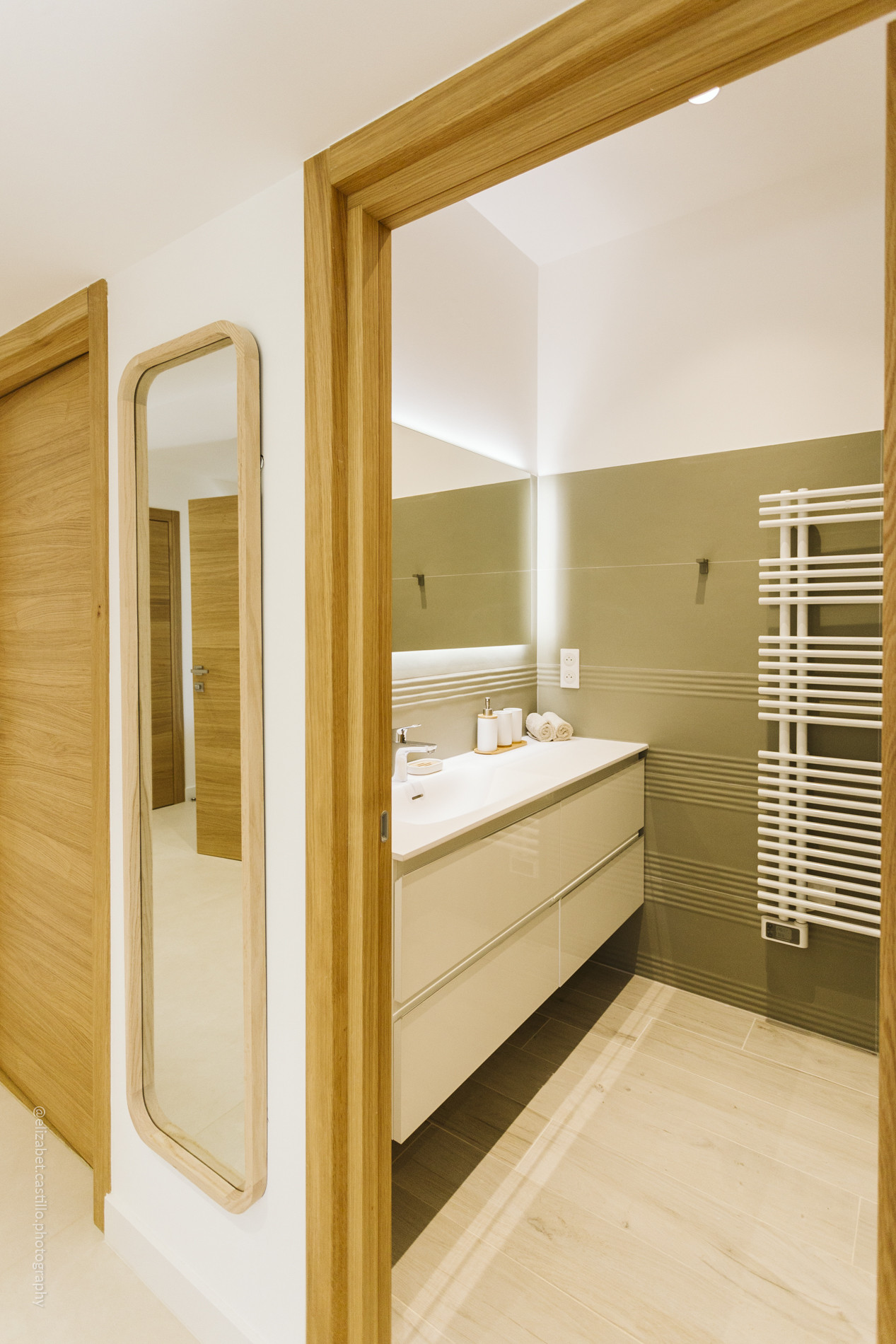 La salle de bain est accessible depuis le couloir. Elle est équipée d’une baignoire avec douchette.