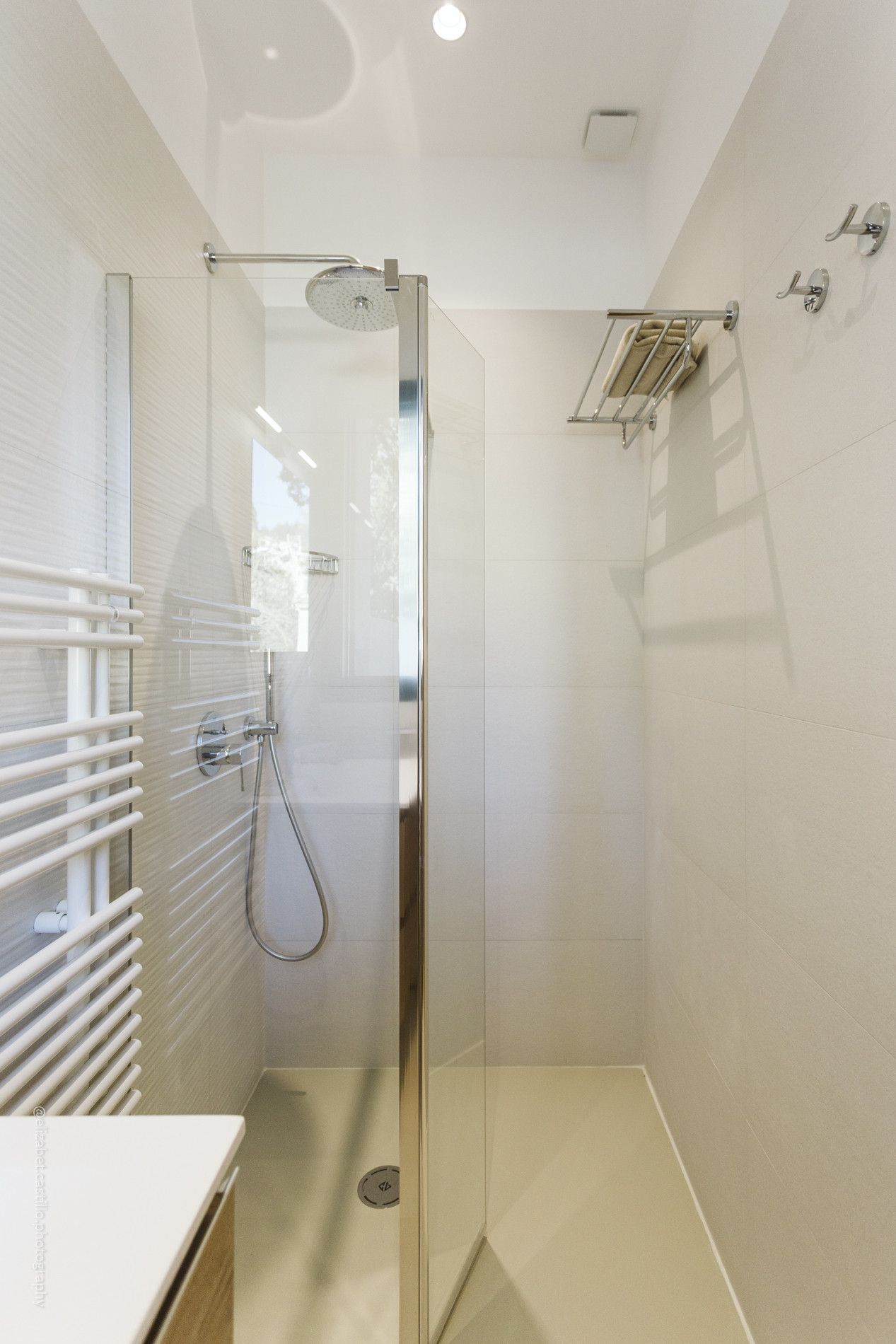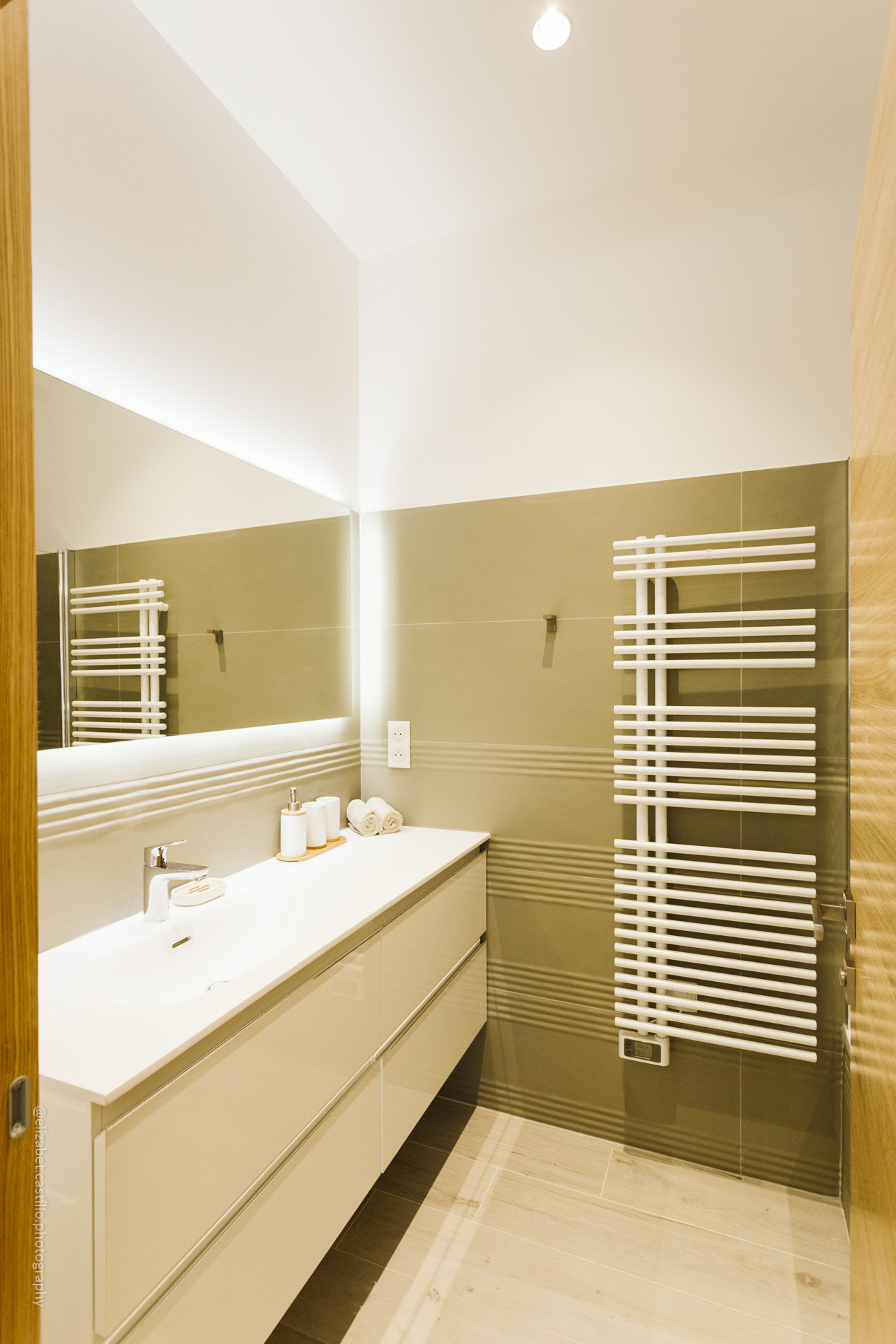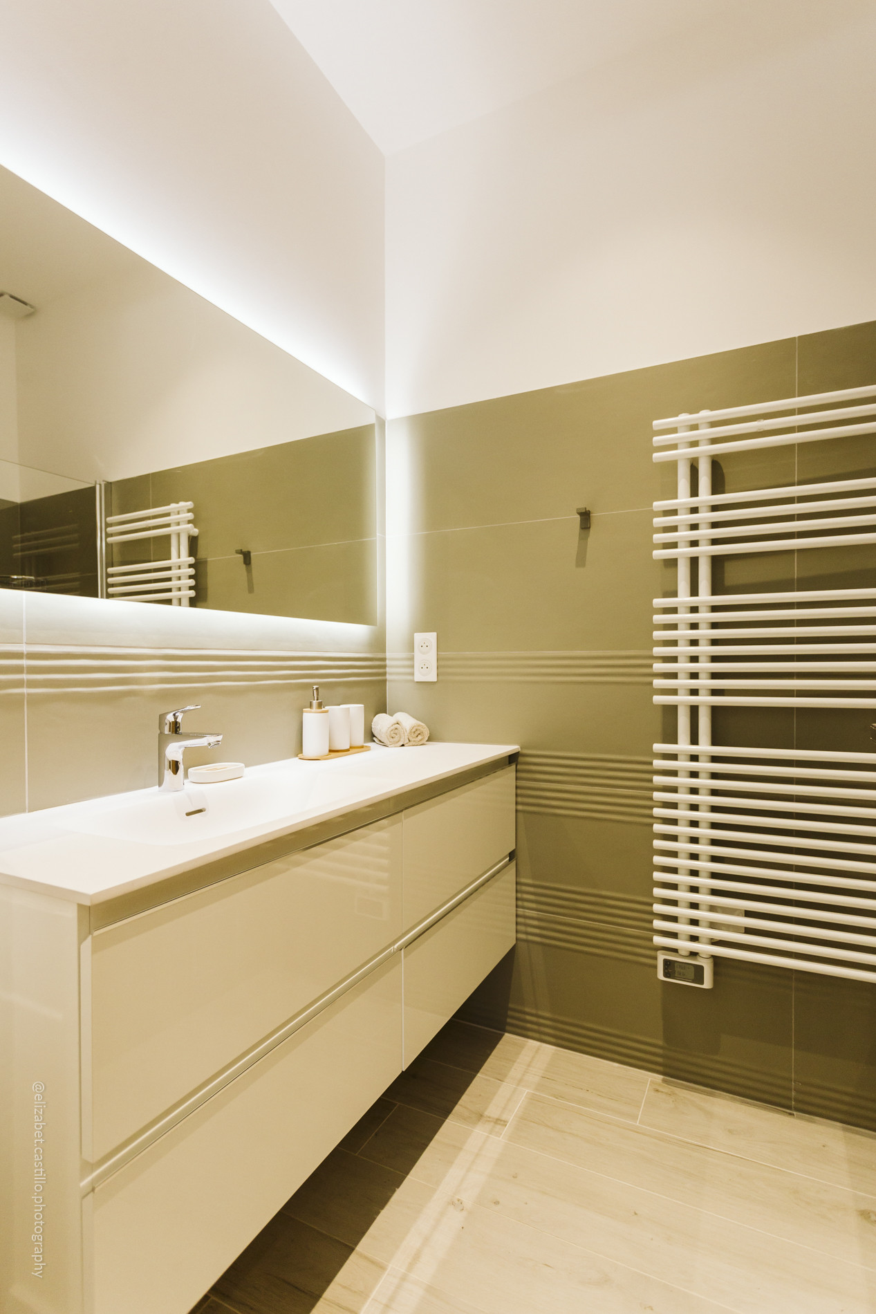 La salle de bain est accessible depuis le couloir. Elle est équipée d’une baignoire avec douchette.