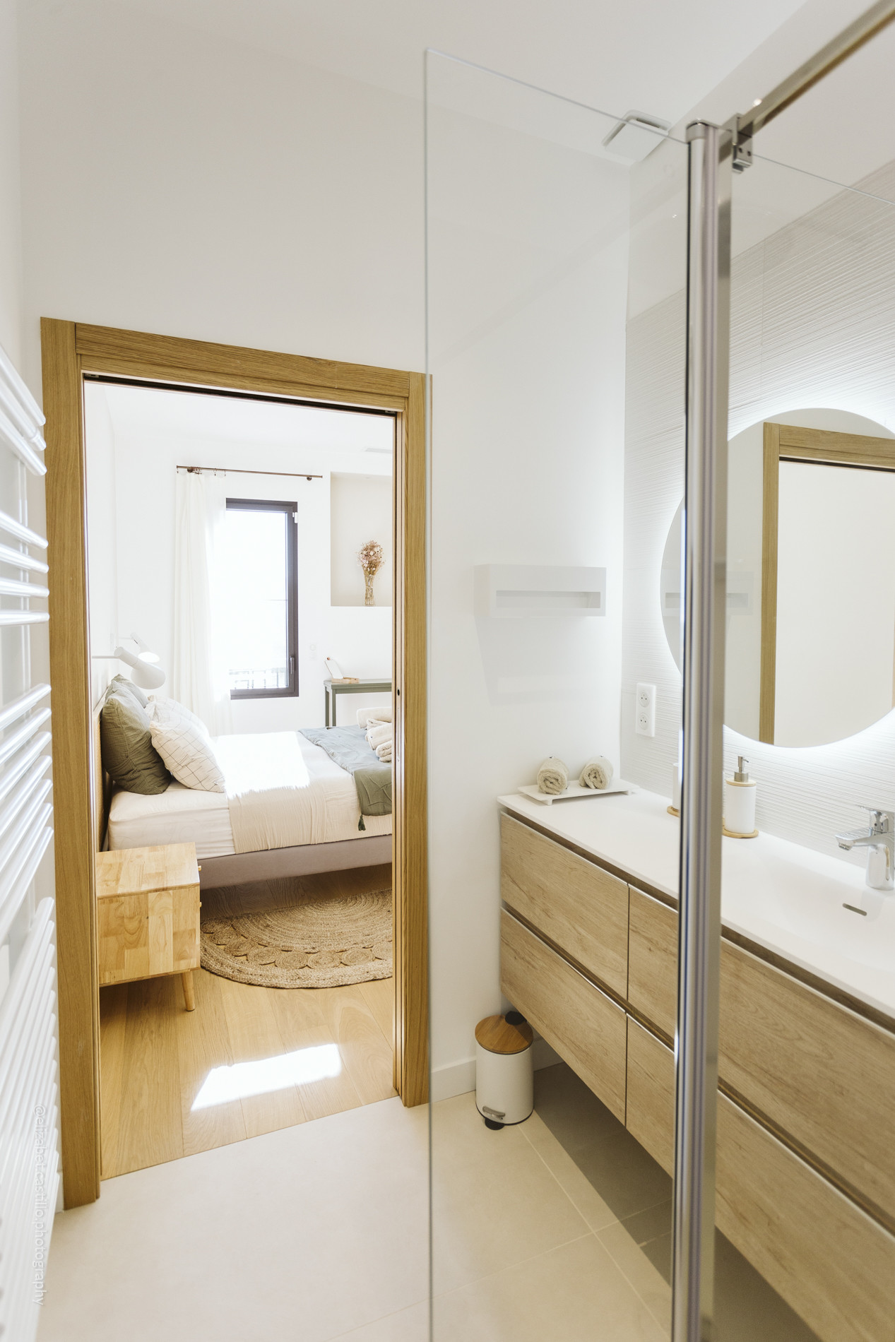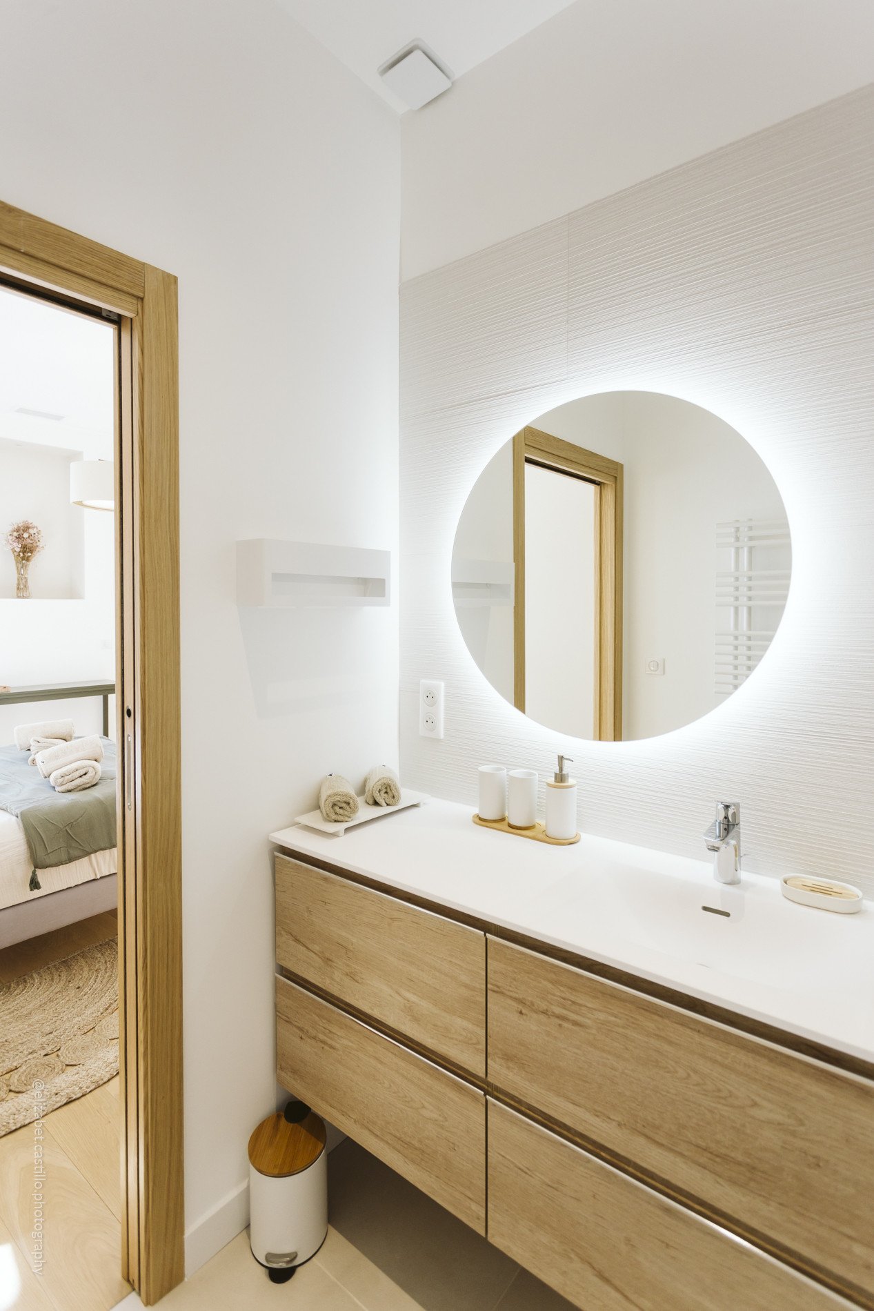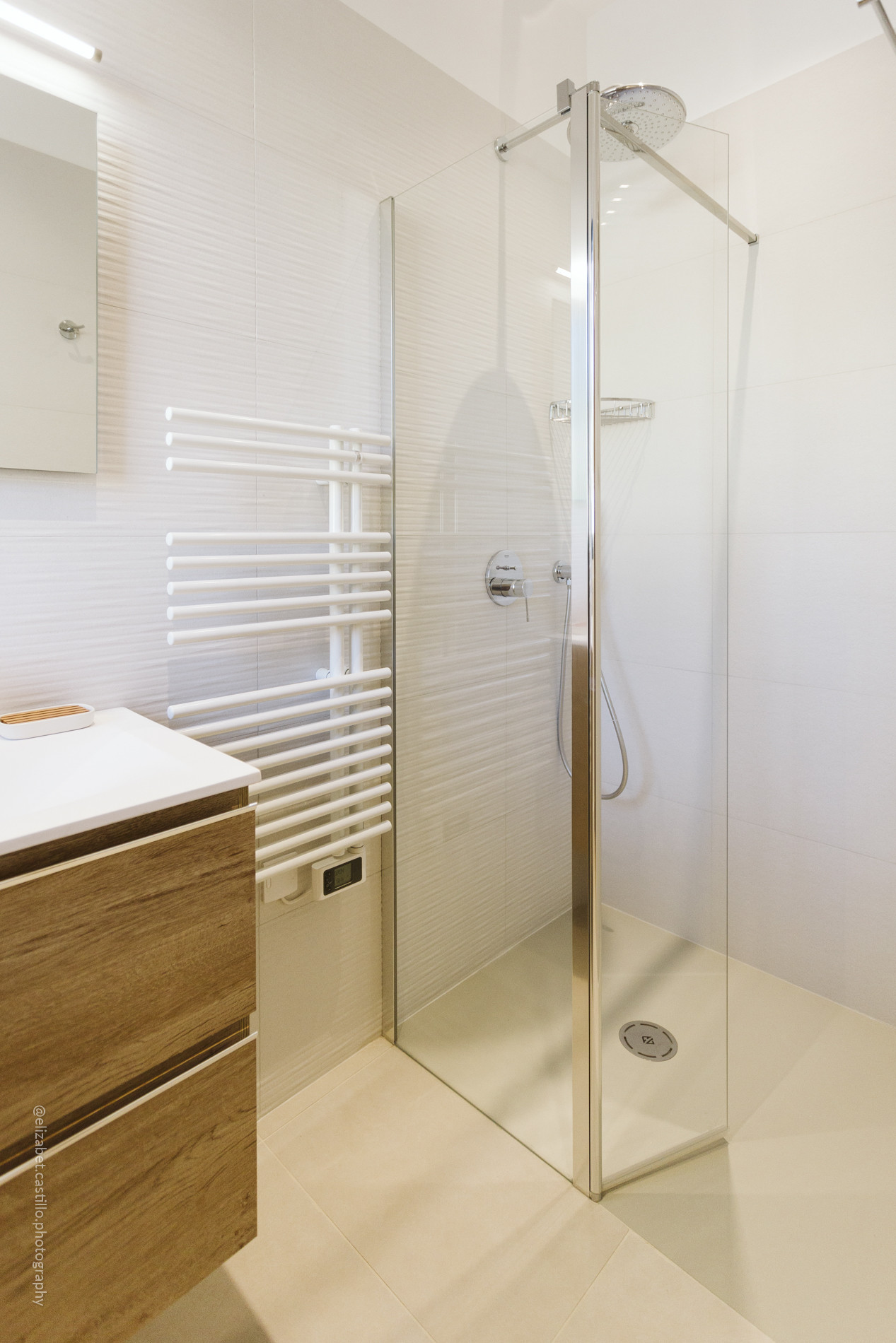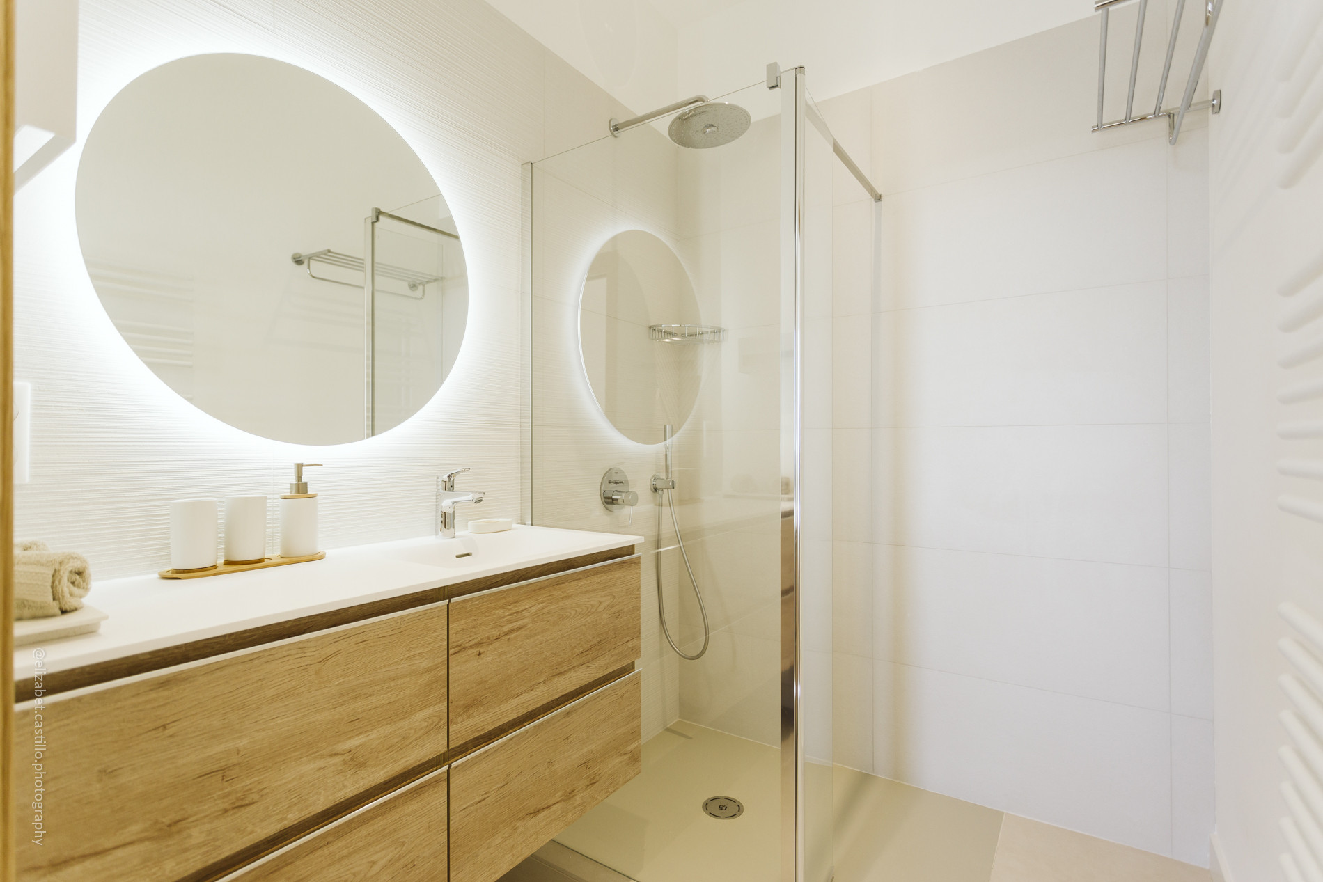 La salle de bain est accessible depuis le couloir. Elle est équipée d’une baignoire avec douchette.