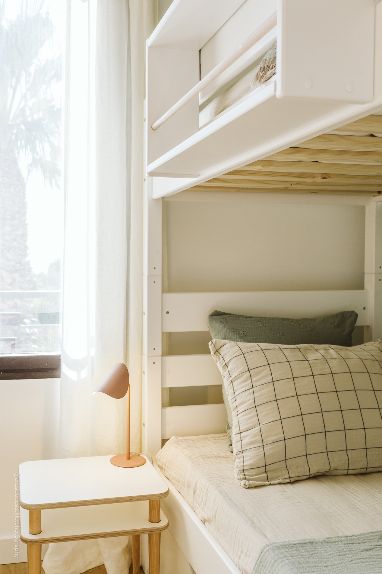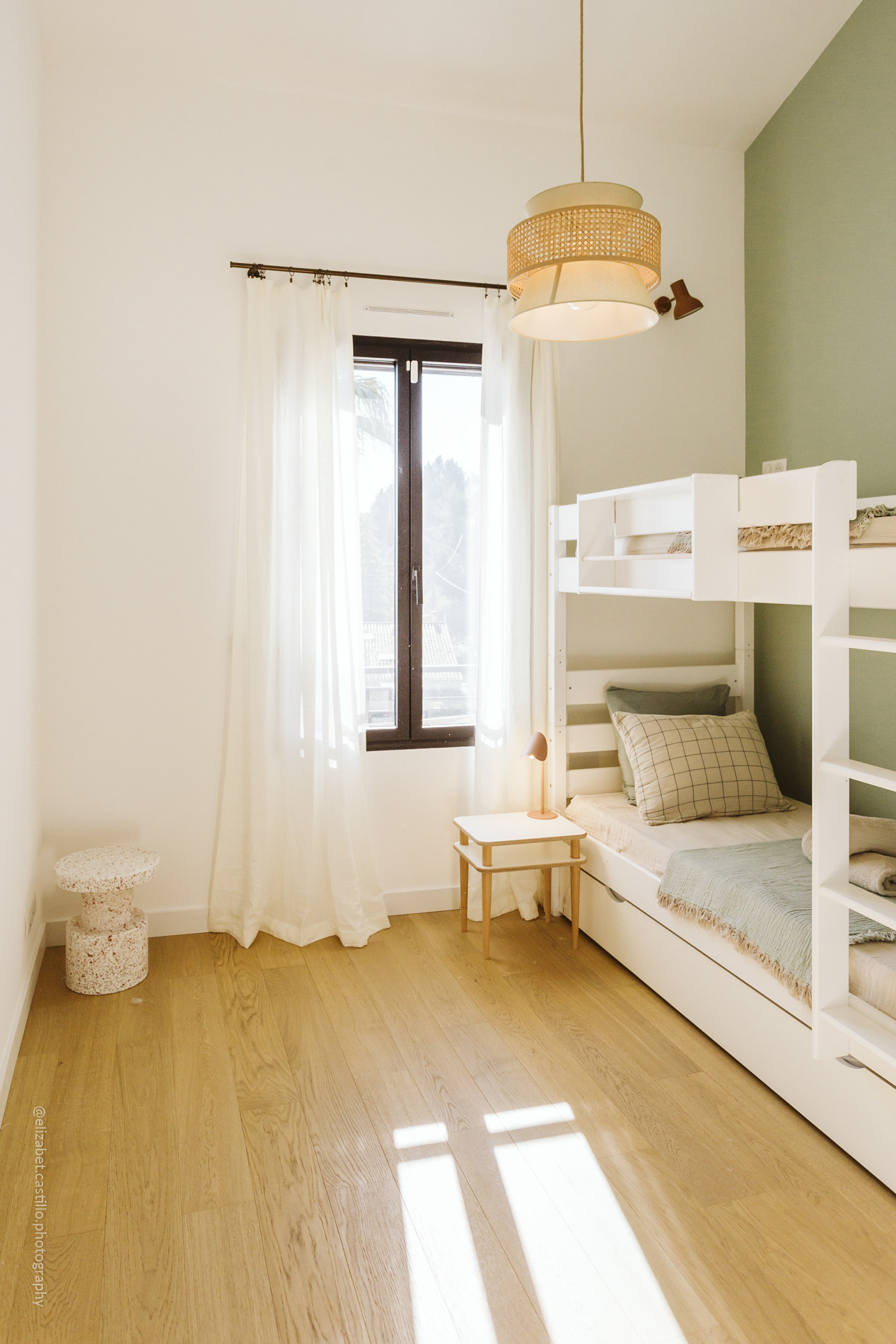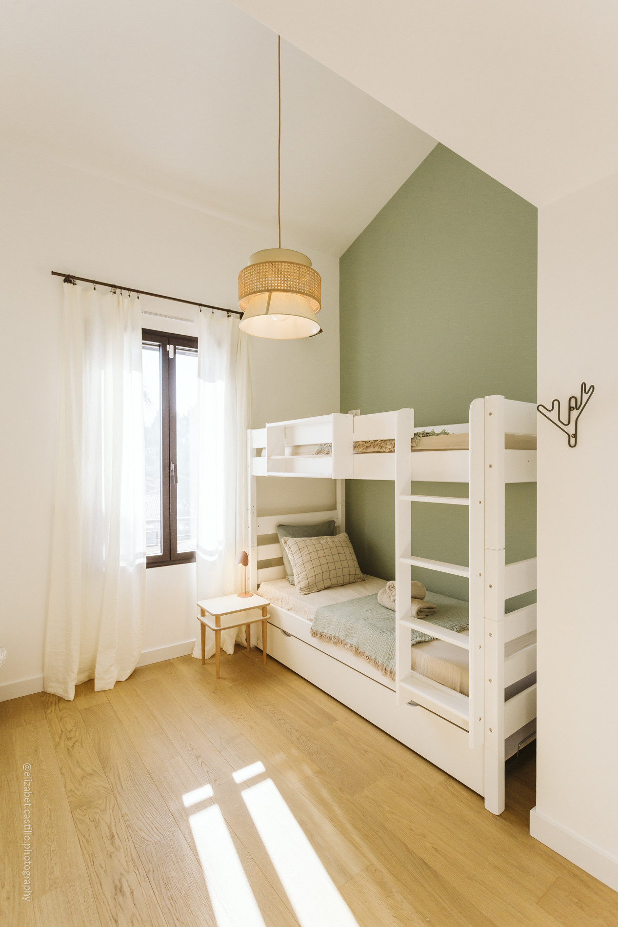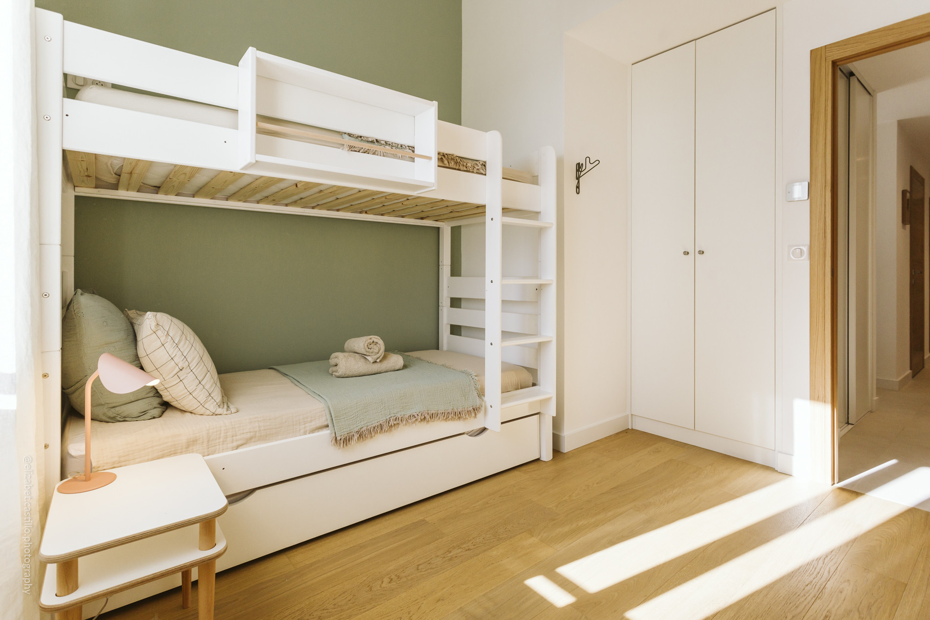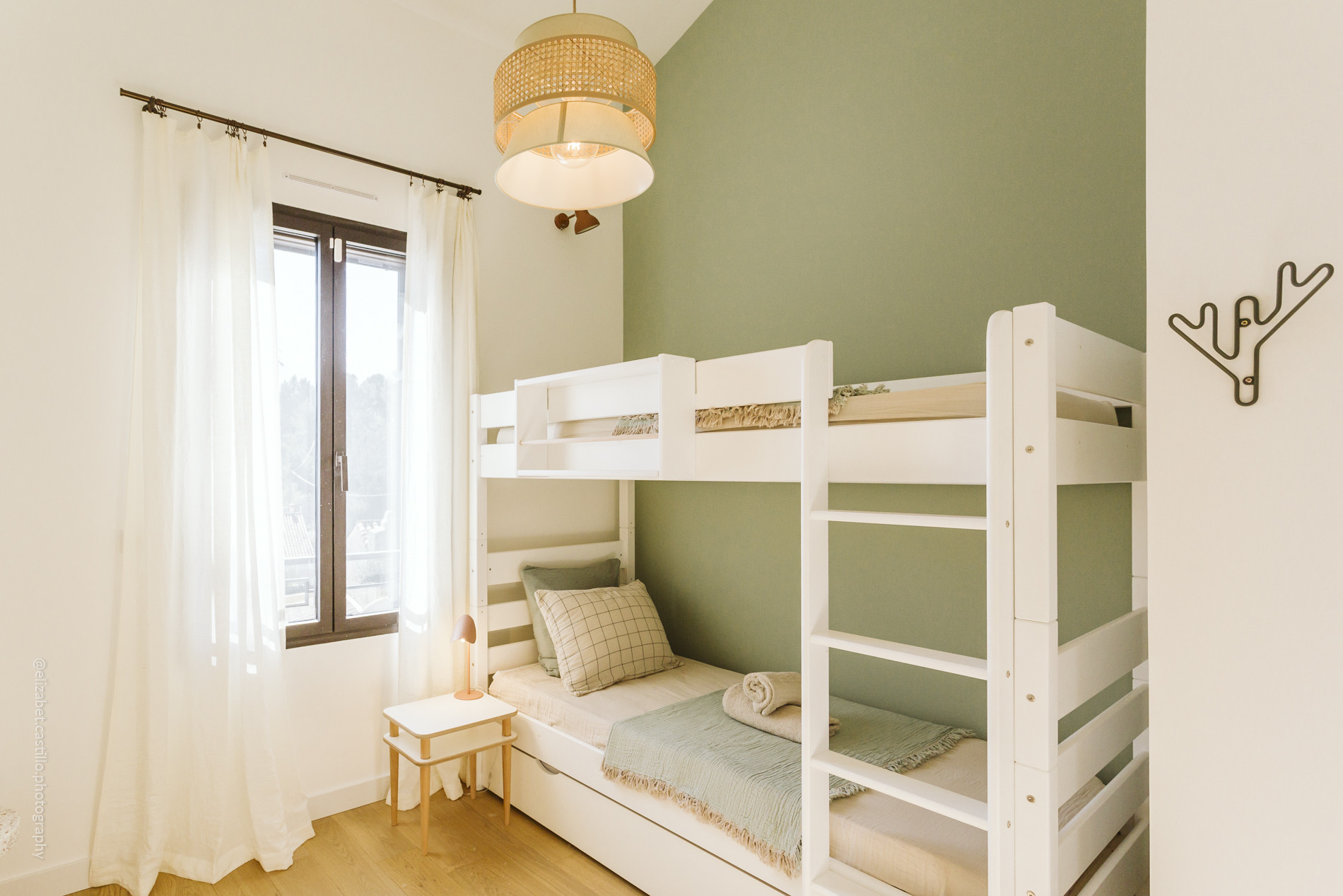 La chambre « Madrague » est dédiée aux enfants avec un lit superposé et gigogne offrant jusqu’à 3 lits simples (90x200), des rangements et placard.
