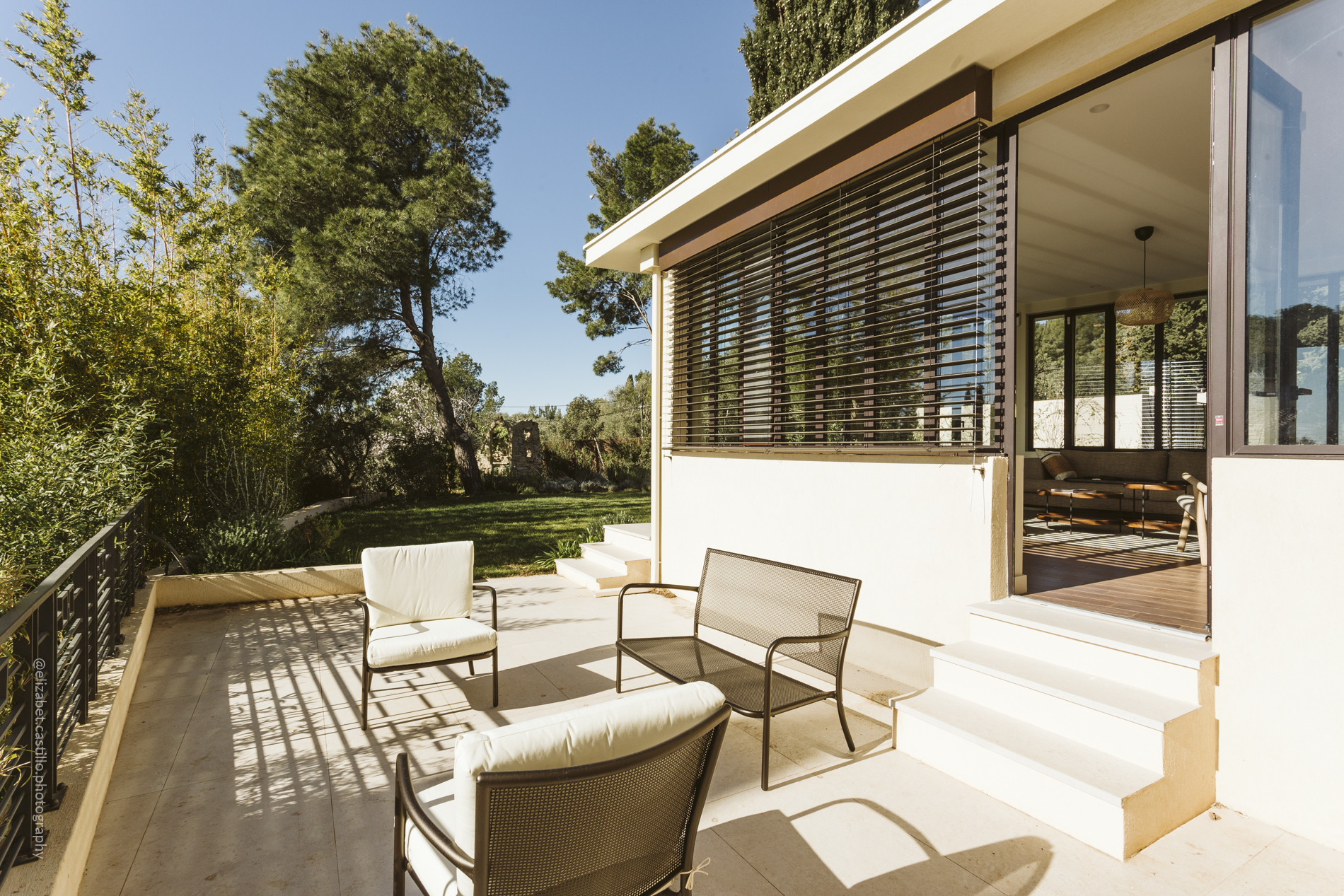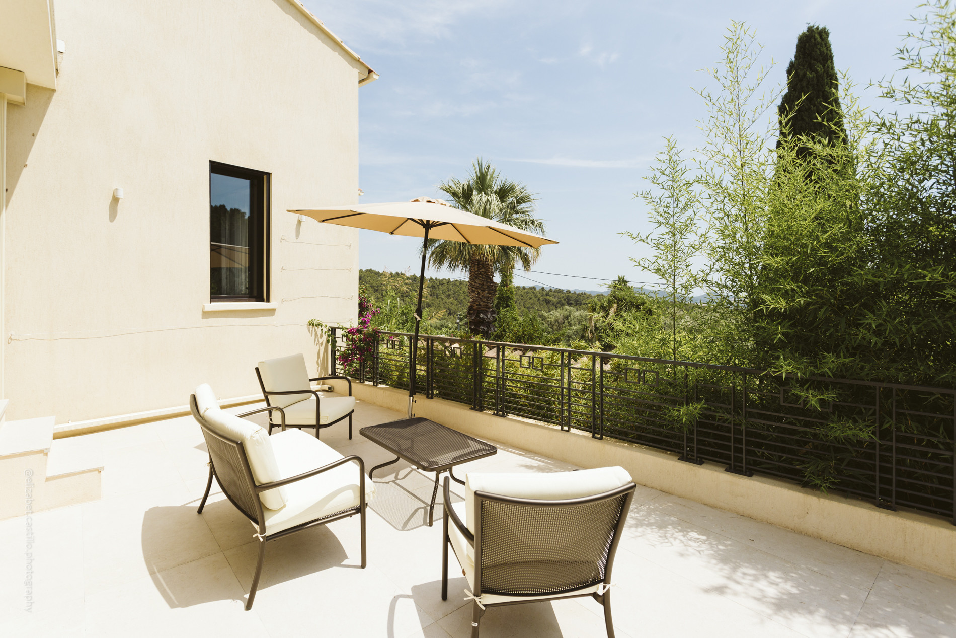 Juste devant, la terrasse prolongée par un petit salon d'extérieur offre un cadre idéal pour des soirées douces ou des instants de convivialité en plein air.