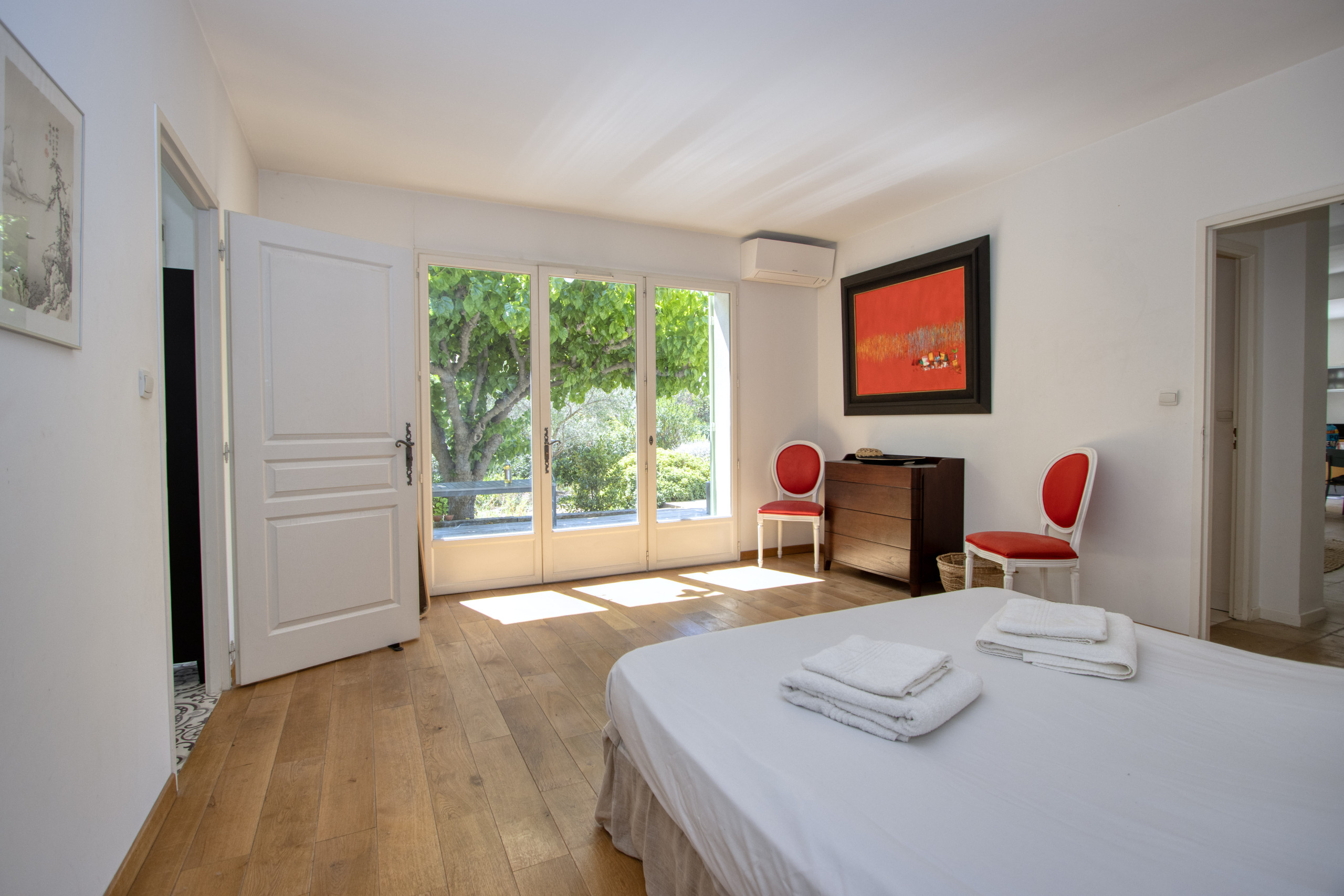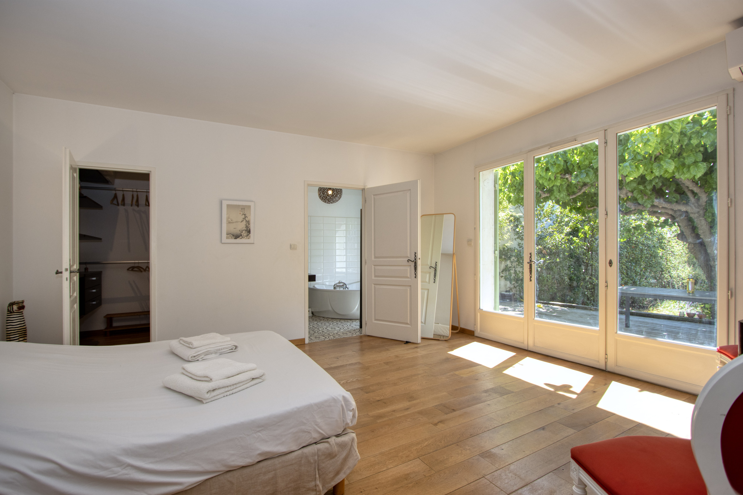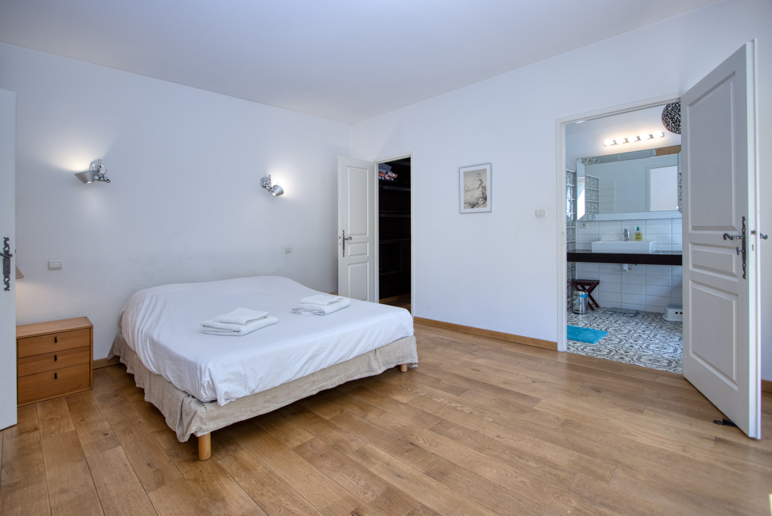La suite parentale climatisée offre une grande surface, un lit de 160 x 200 cm et une belle luminosité avec ses 3 larges portes vitrées donnant accès à la terrasse. Vous profiterez d’une large salle de bain privative avec douche et baignoire mais aussi d’un dressing.
