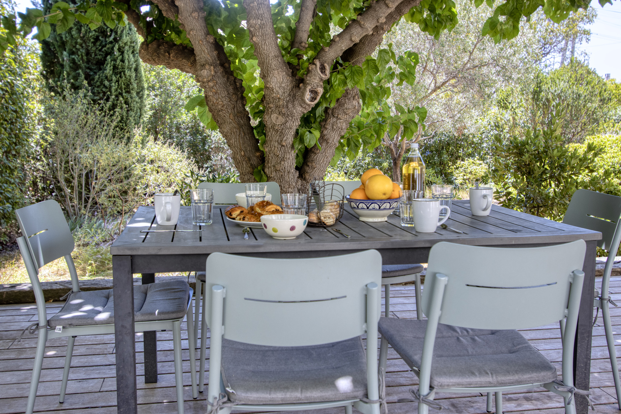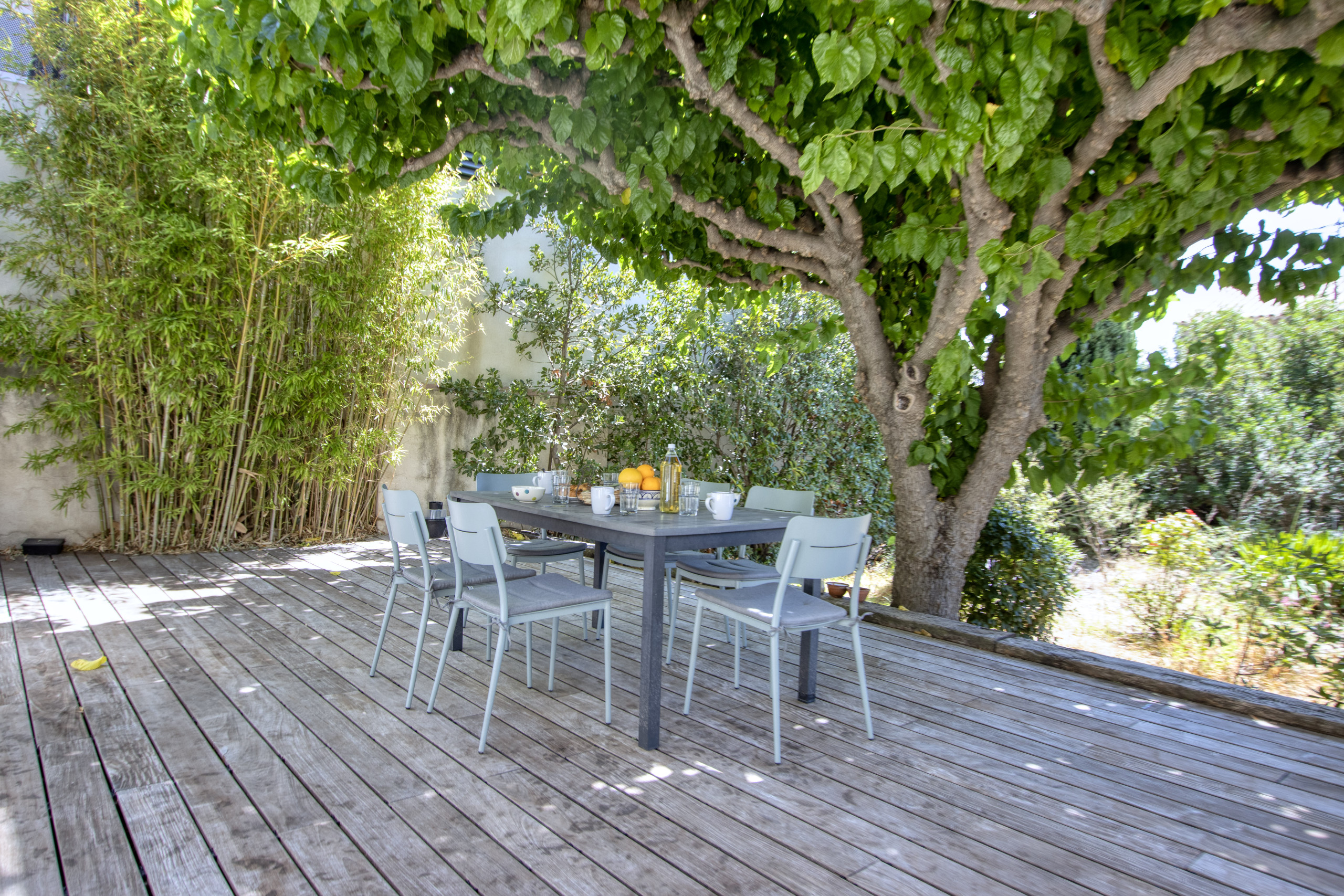 Un des atouts de la maison est son extérieur. Le jardin méditerranéen est très agréable, la terrasse de belle taille, délicatement ombragée par les arbres vous offre un joli espace repas pour profiter du BBQ avec vos proches.