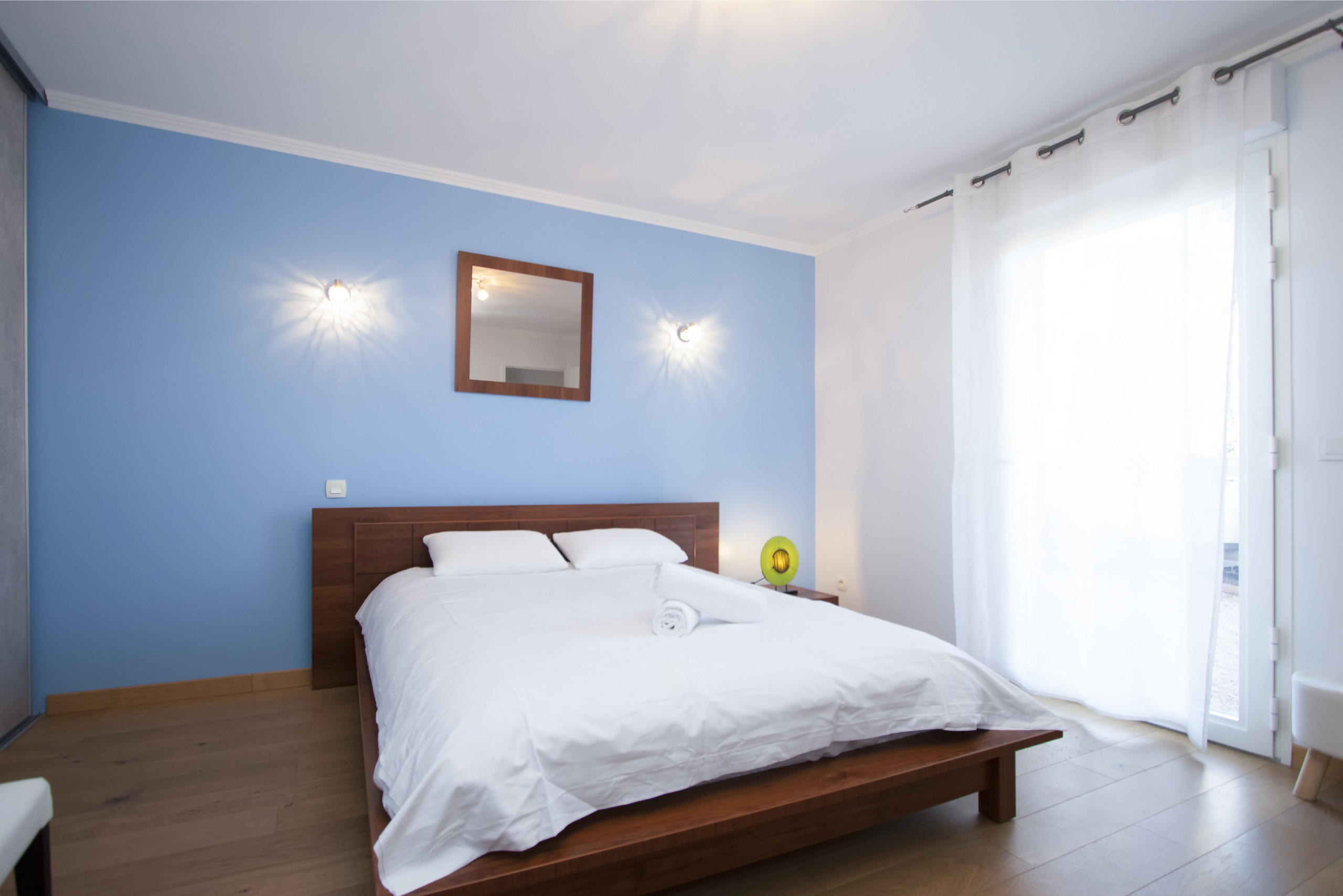 La chambre est spacieuse, lumineuse avec sa baie vitrée et décorée avec attention. Elle propose une literie de qualité, une grande armoire avec penderie.